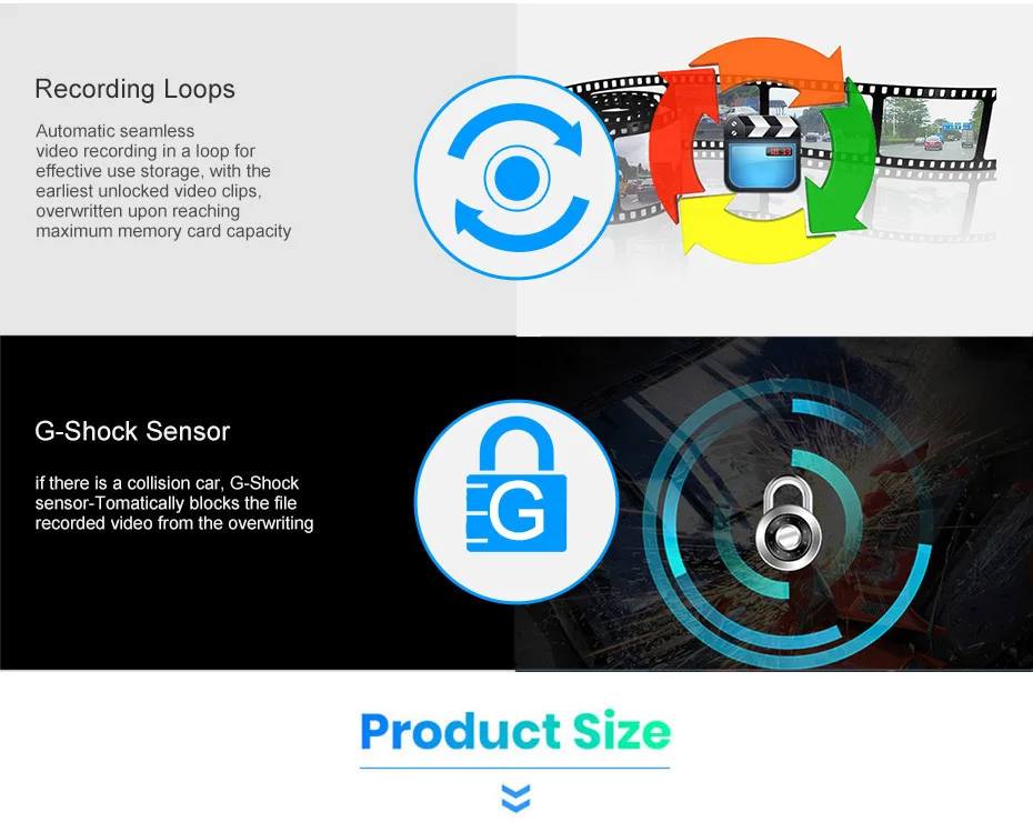 За исключением одновременной записи передней и задней камеры, этот видеорегистратор также оснащен еще одним объективом слепой зоны. Пришло время попрощаться с вождением слепой зоны, обеспечить безопасную парковку и вождение автомобиля.Примечания:Правый и левый слепой объектив камеры может отображаться только для безопасной парковки, не может сделать файлы видеозаписи. Только переднюю и заднюю камеру можно снимать видео.