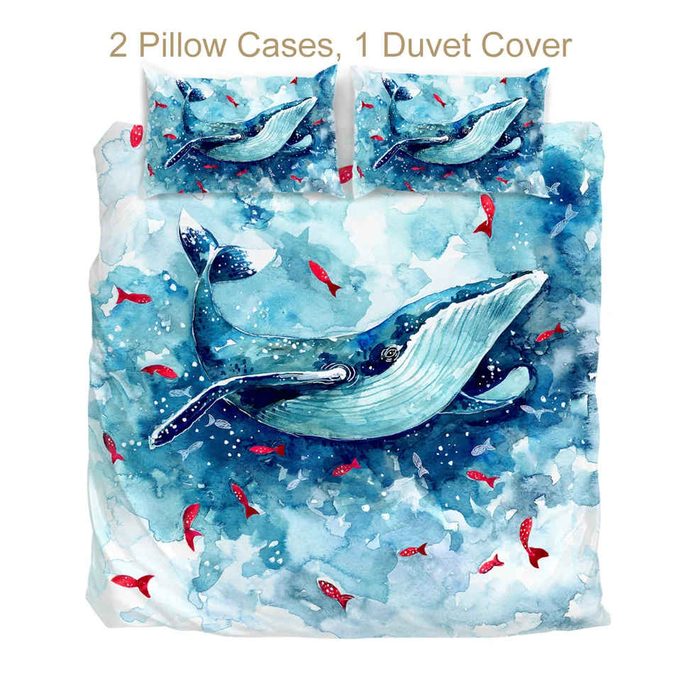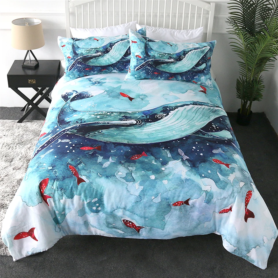 Постельное белье на выход КИТ, Комплект постельного белья, акварельные животные, пододеяльник, набор, синий и белый домашний текстиль, красная рыба, океан, море, постельное белье
