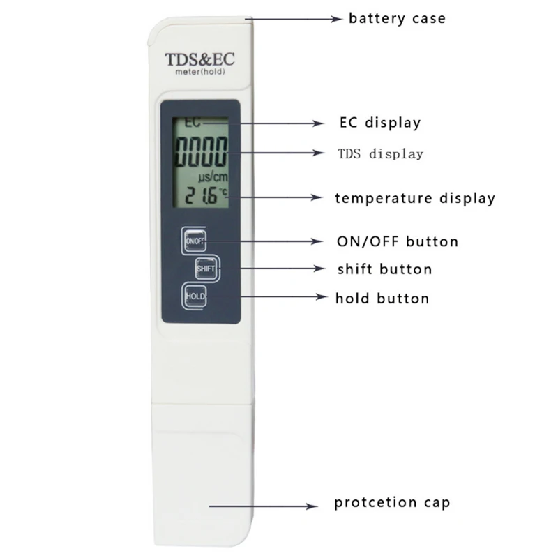 4 режима отображения: Нажмите кнопку переключения: TDS - ppm & °C, EC - μs/cm & °C, TDS - ppm & °F, EC - μs/cm & °F.