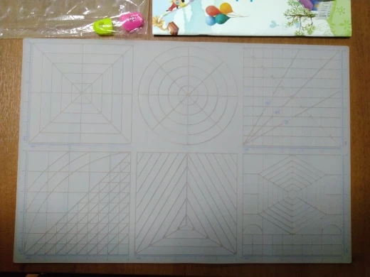 На самом деле прибыл коврик не точно такой как на фото. Не квадратный (4 малых квадрата), а прямоугольный (6 малых квадратов). Т.е. больше заявленного. Но, может быть кому-то важно. Размер коврика 277x416мм. Размер каждого малого квадрата 127x127мм (5x5 дюймов). Шкала на малых квадратах и расстояния между линиями на них в дюймах и долях дюйма. Книжка-подарок (формат 174x255мм) содержит 20 листов = 40 стр = 40 моделей. И, главное, к ней прилагался плотный прозрачный термостойкий (надеюсь, ещё не пробовали) лист размером 170x250мм. Ещё были два силиконовых напёрстка разных размеров. Один налазит и на взрослый палец, а другой поменьше.