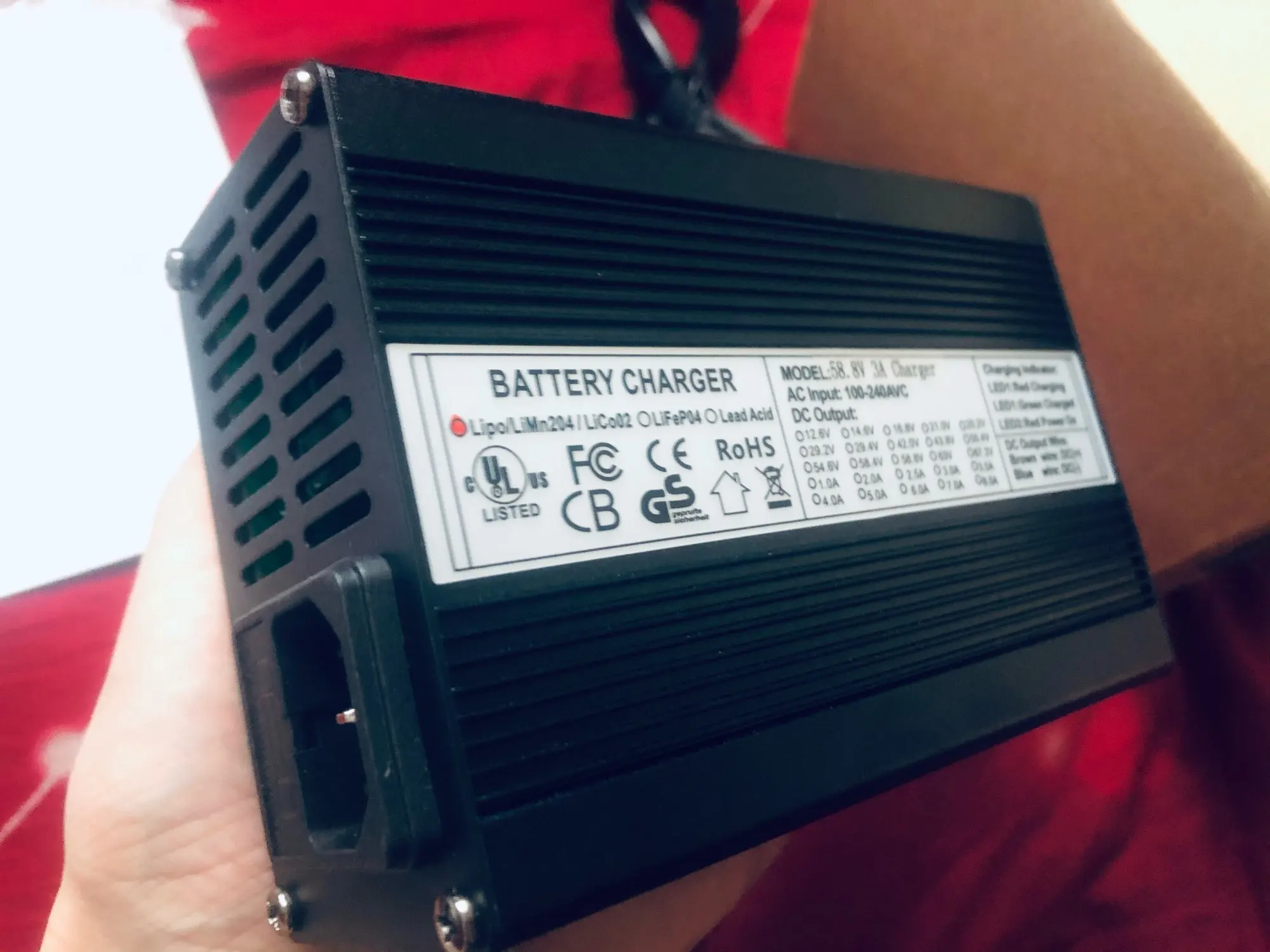 Выдаёт 59 вольт. Компактный, лёгкий. Внешне всё как в описании.