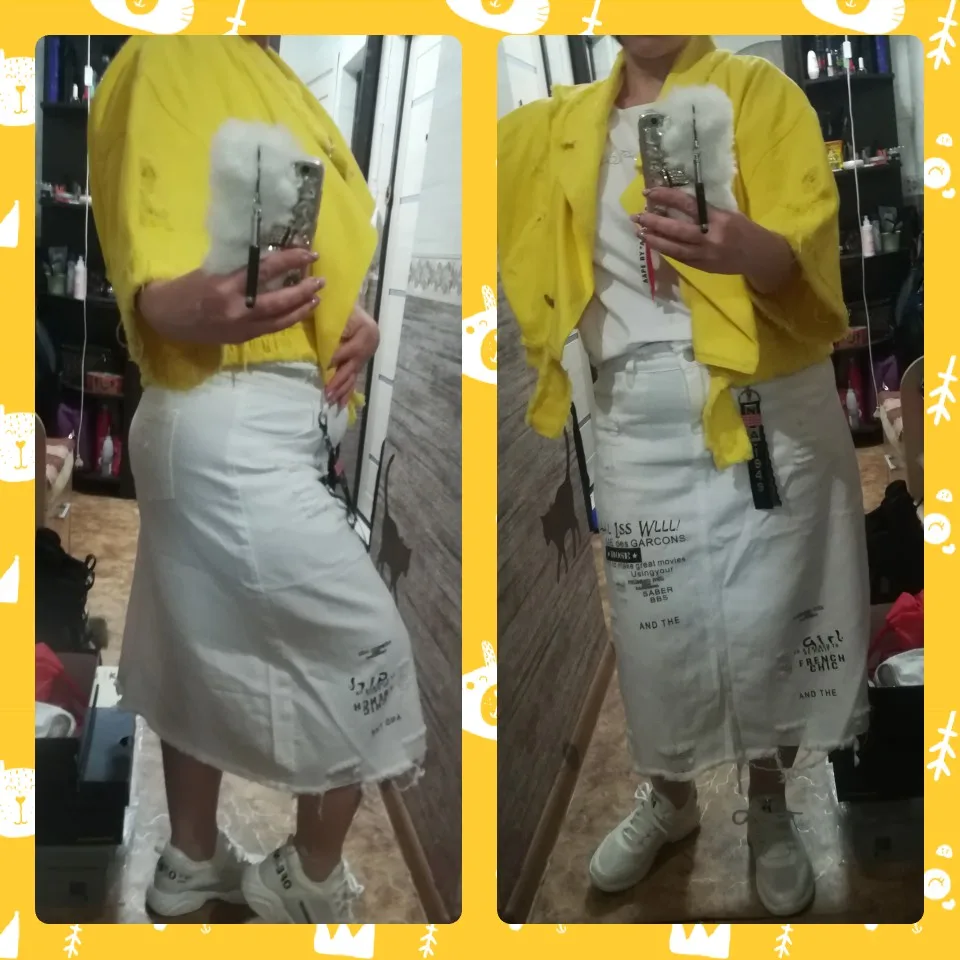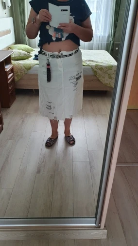 Юбка не чисто белая, а с желтизной, фурнитура ооочень дешёвая и молния вшита неаккуратно, волной, петля обметана, как для блузки, а не для джинсовой юбки, не прорезана. Ремень очень жёсткий, как из пластика, тоже очень дешовский. Юбка понравилась на фото, решила заказать, но, если бы увидела её в реальности, то точно бы не заказала.