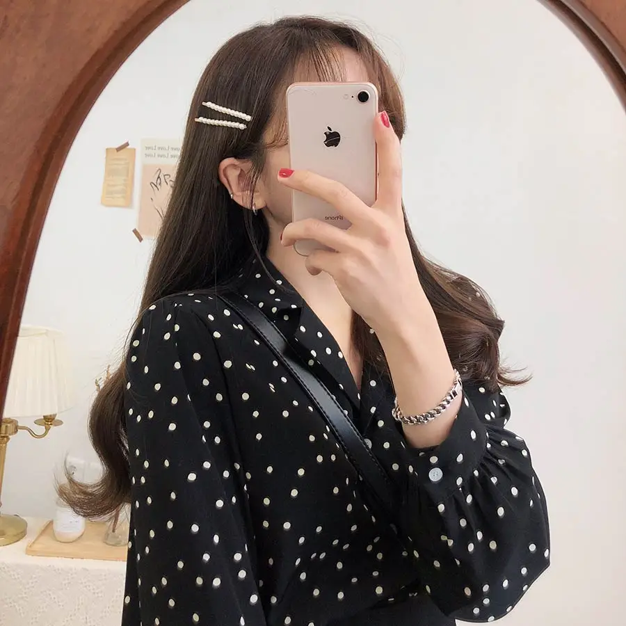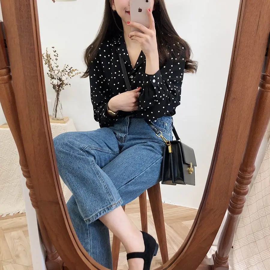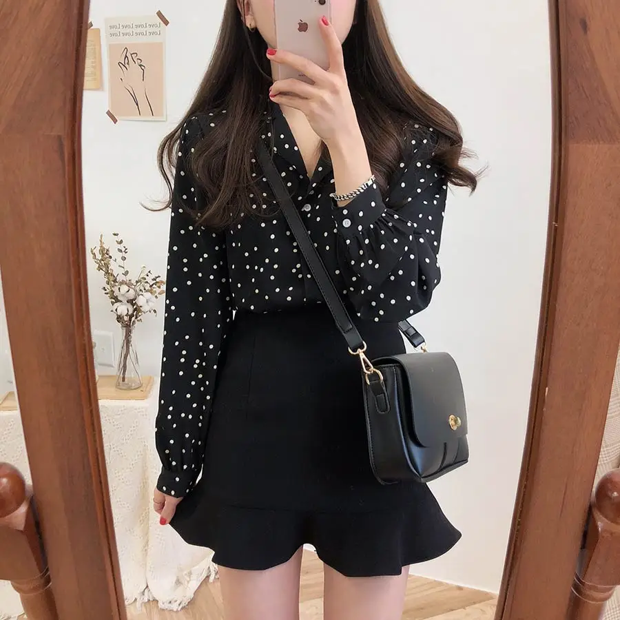 2021 Весенняя рубашка, женская блузка, летняя женская блузка, шифоновая блуза, Повседневная элегантная винтажная блуза в горошек с длинным рукавом