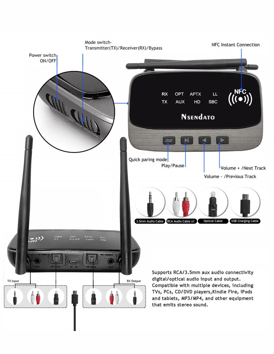 Отличный продавец прибыл очень быстрый продукт 262ft/80m NFC Bluetooth 5,0 стерео воспроизведение музыки передатчик 3 в 1 беспроводной аудио адаптер с низкой задержкой aptX HD.
