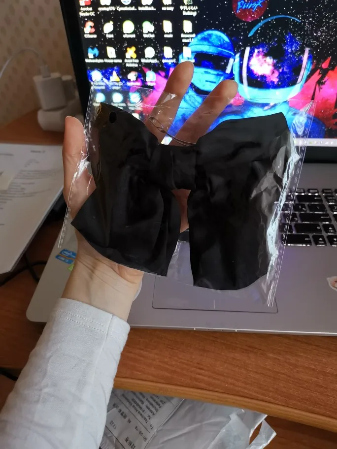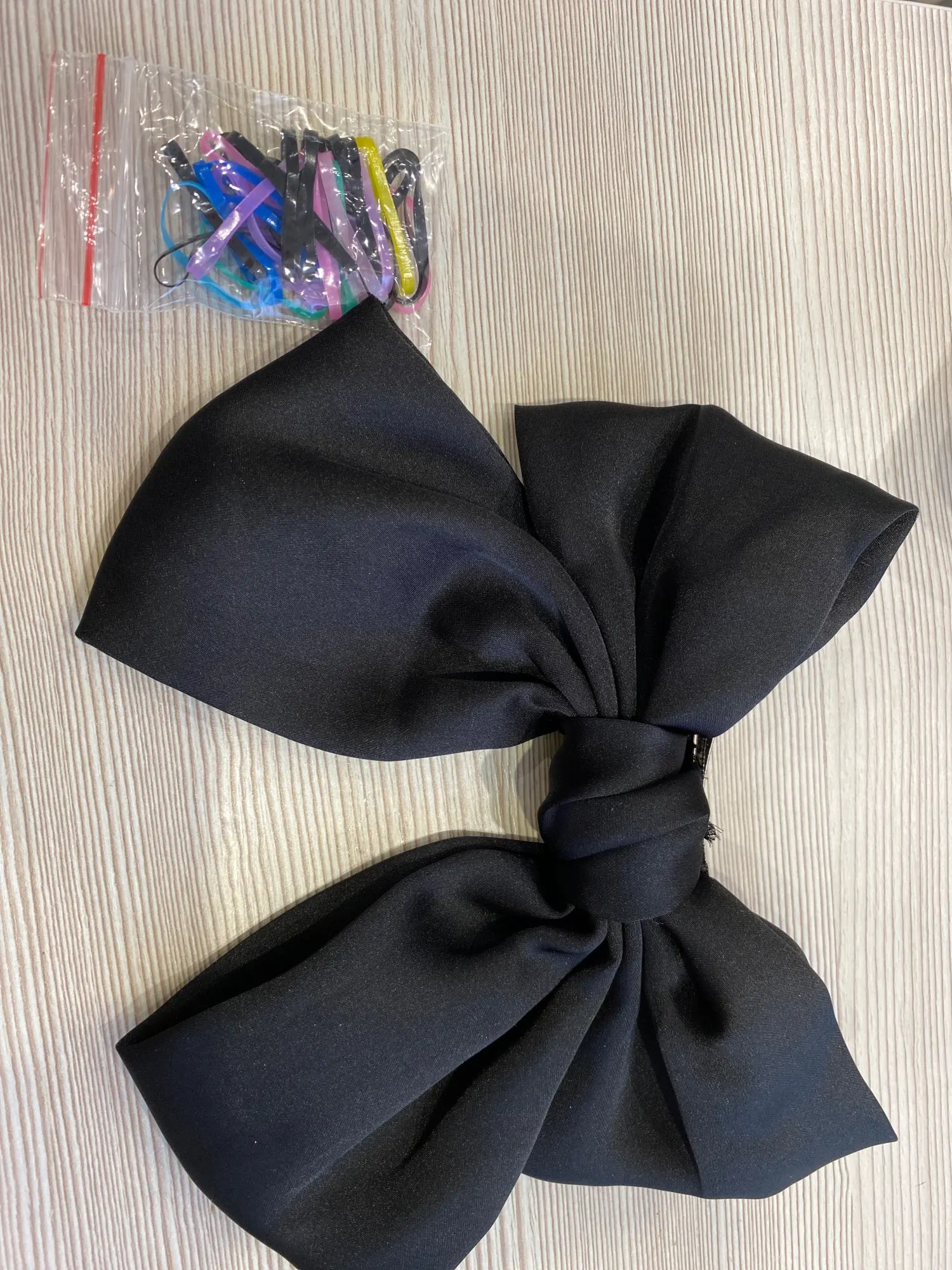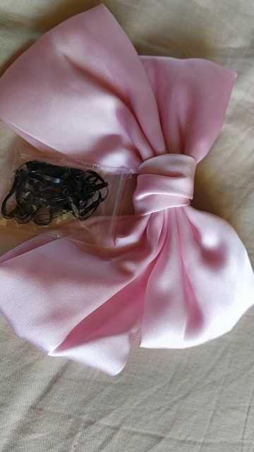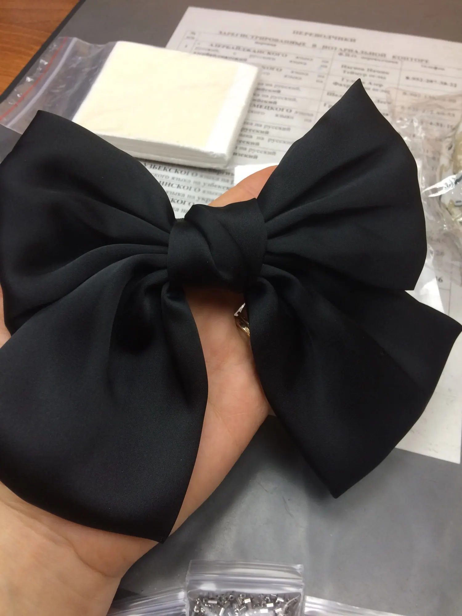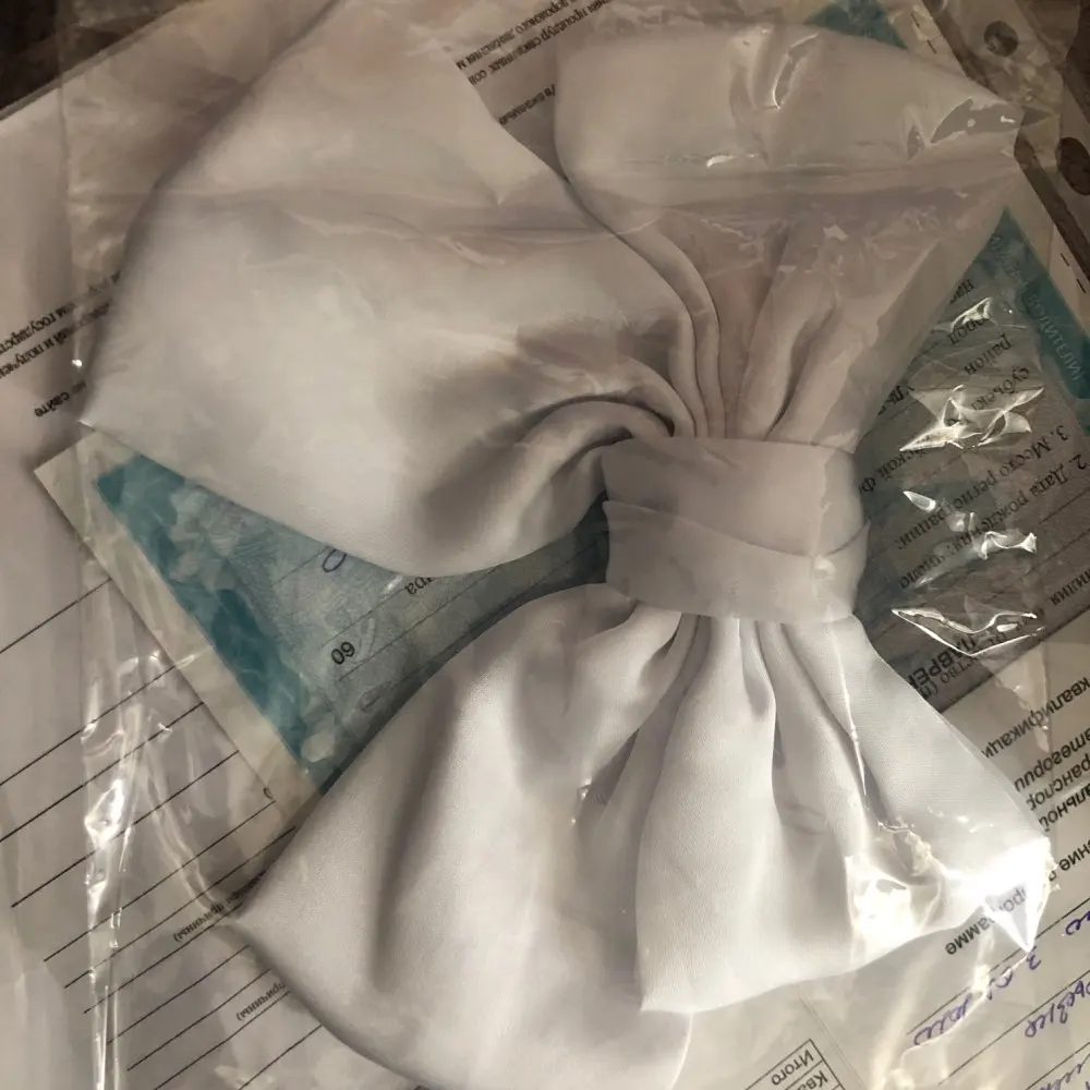 выглядит отлично. материал приятный, шелковистый. ткань не толстая, но форму держит. заколка крепкая, отлично держит тонкие волосы. неприятных запахов нет. 11.11 заказано, получено в объединенной посылке 04.12 в почтомате пятерочки