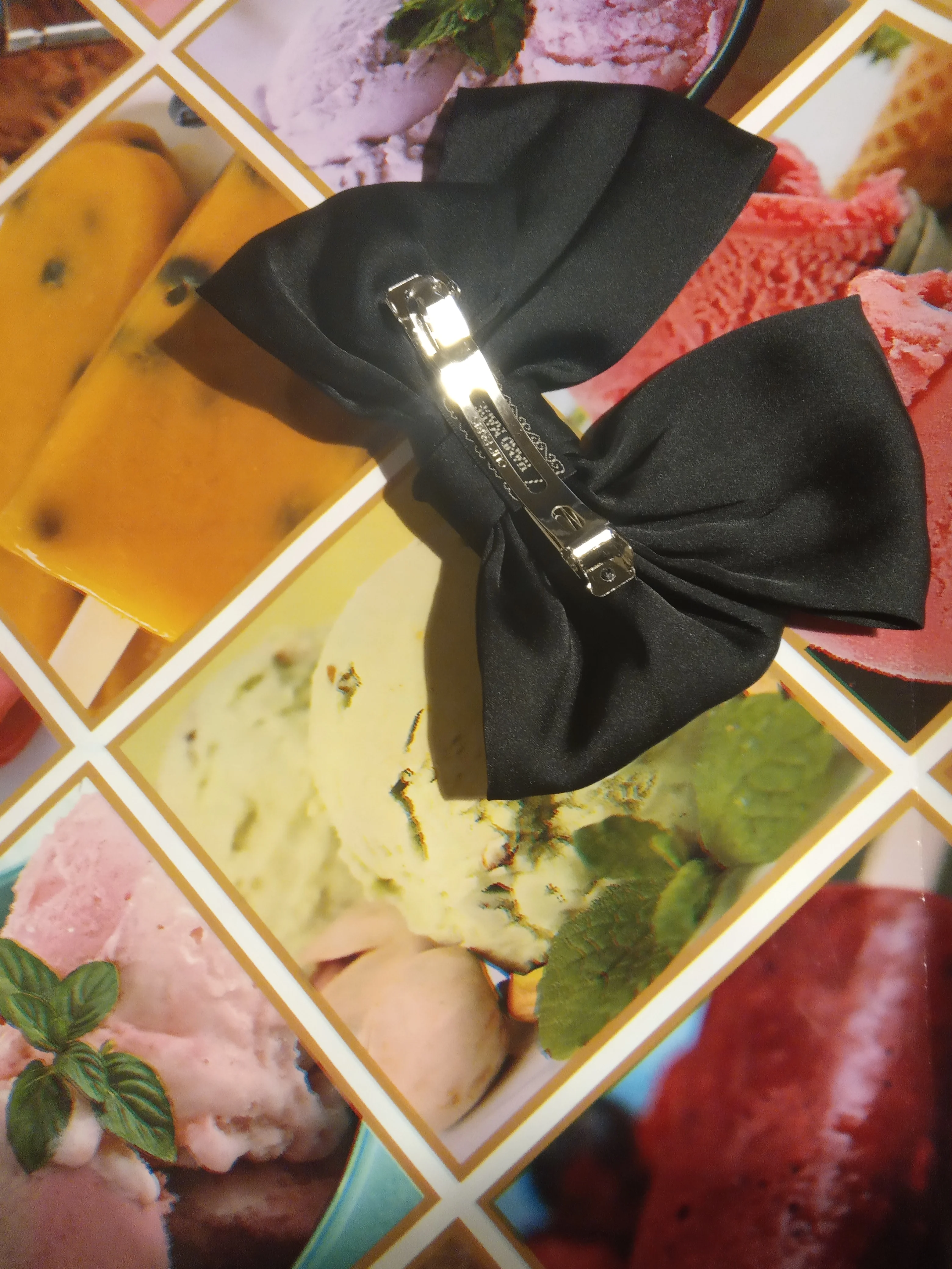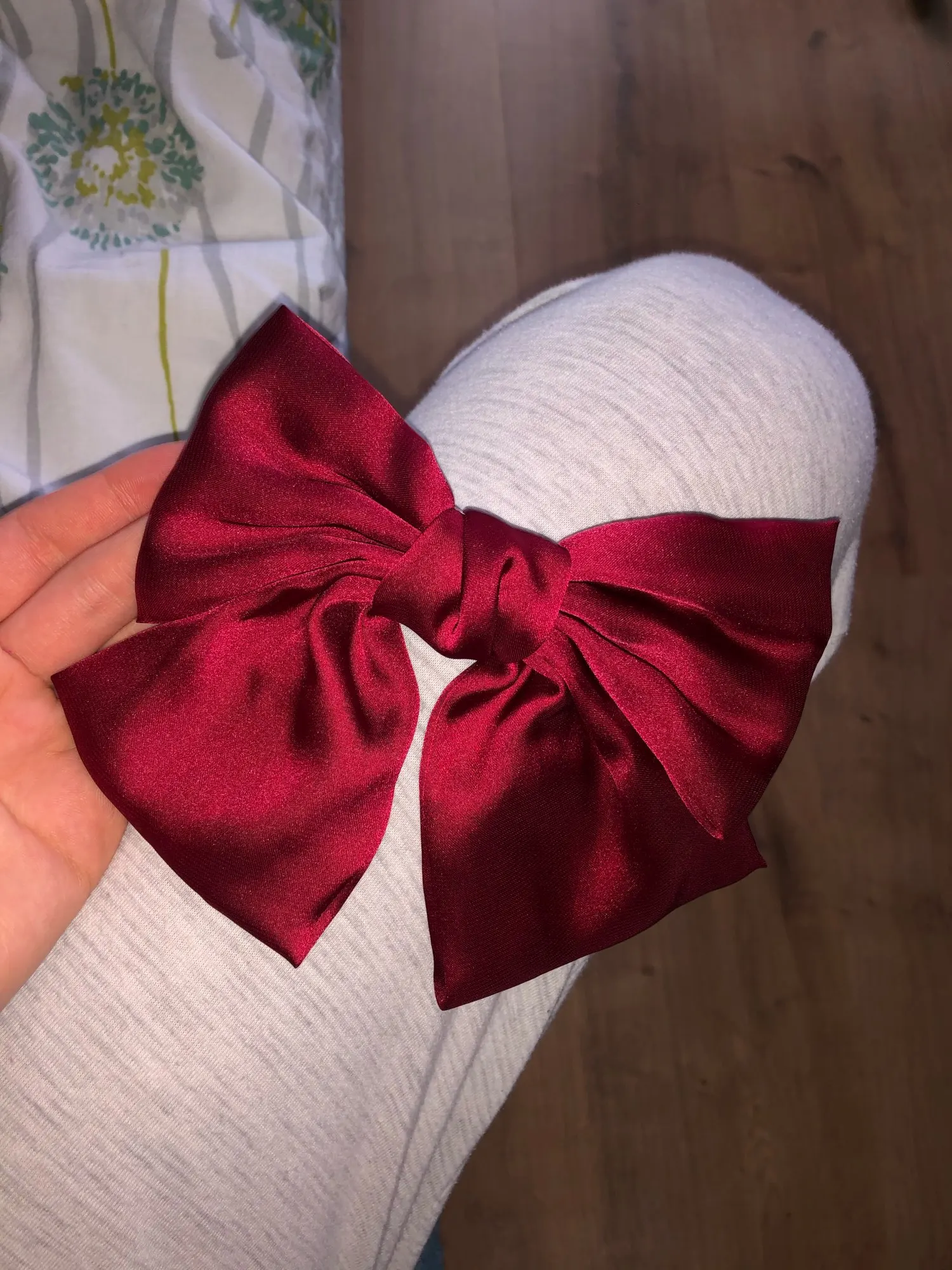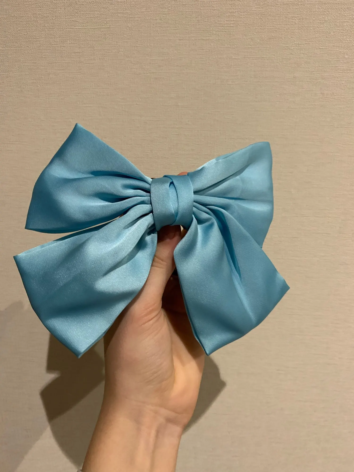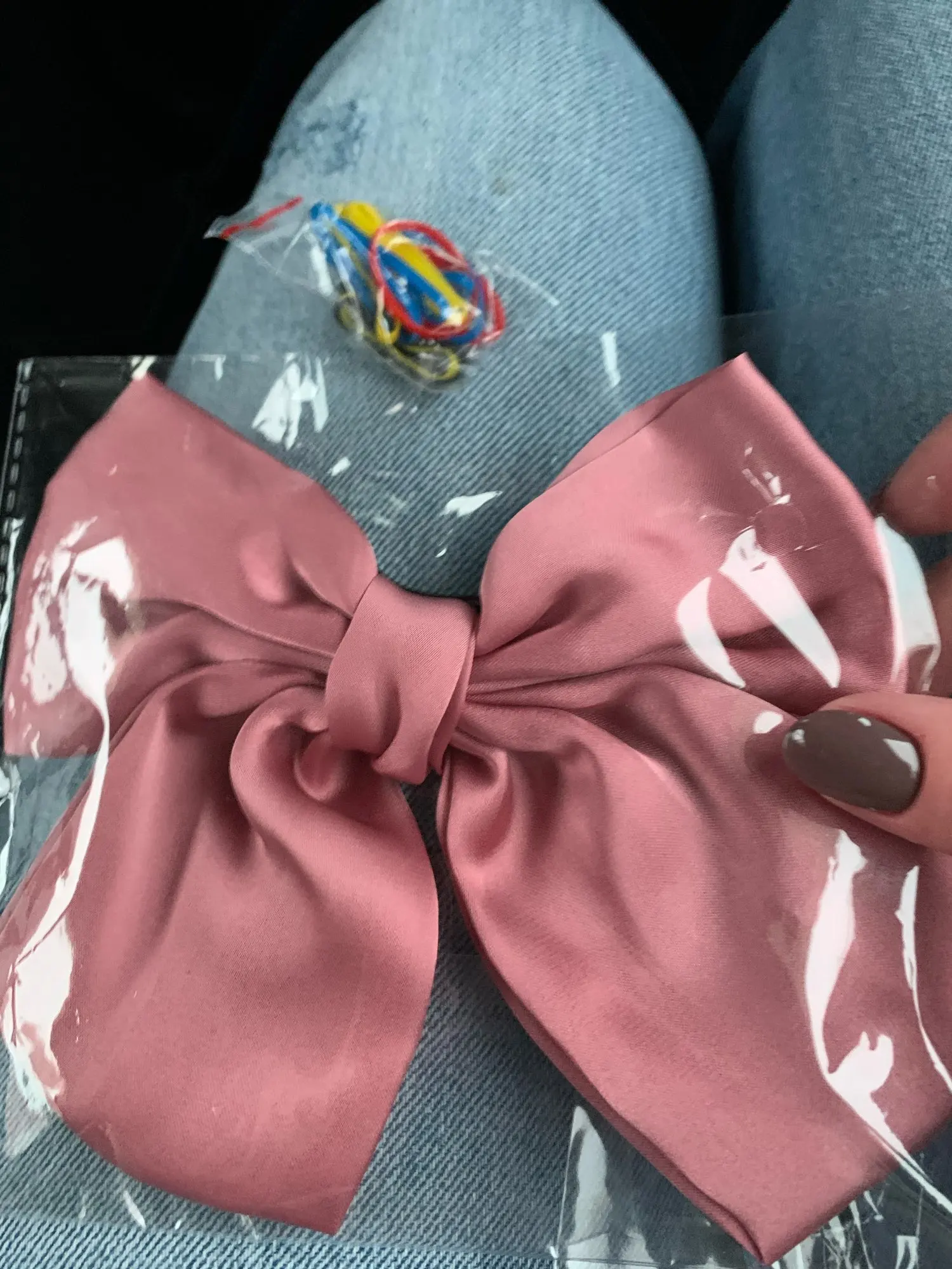 выглядит отлично. материал приятный, шелковистый. ткань не толстая, но форму держит. заколка крепкая, отлично держит тонкие волосы. неприятных запахов нет. 11.11 заказано, получено в объединенной посылке 04.12 в почтомате пятерочки