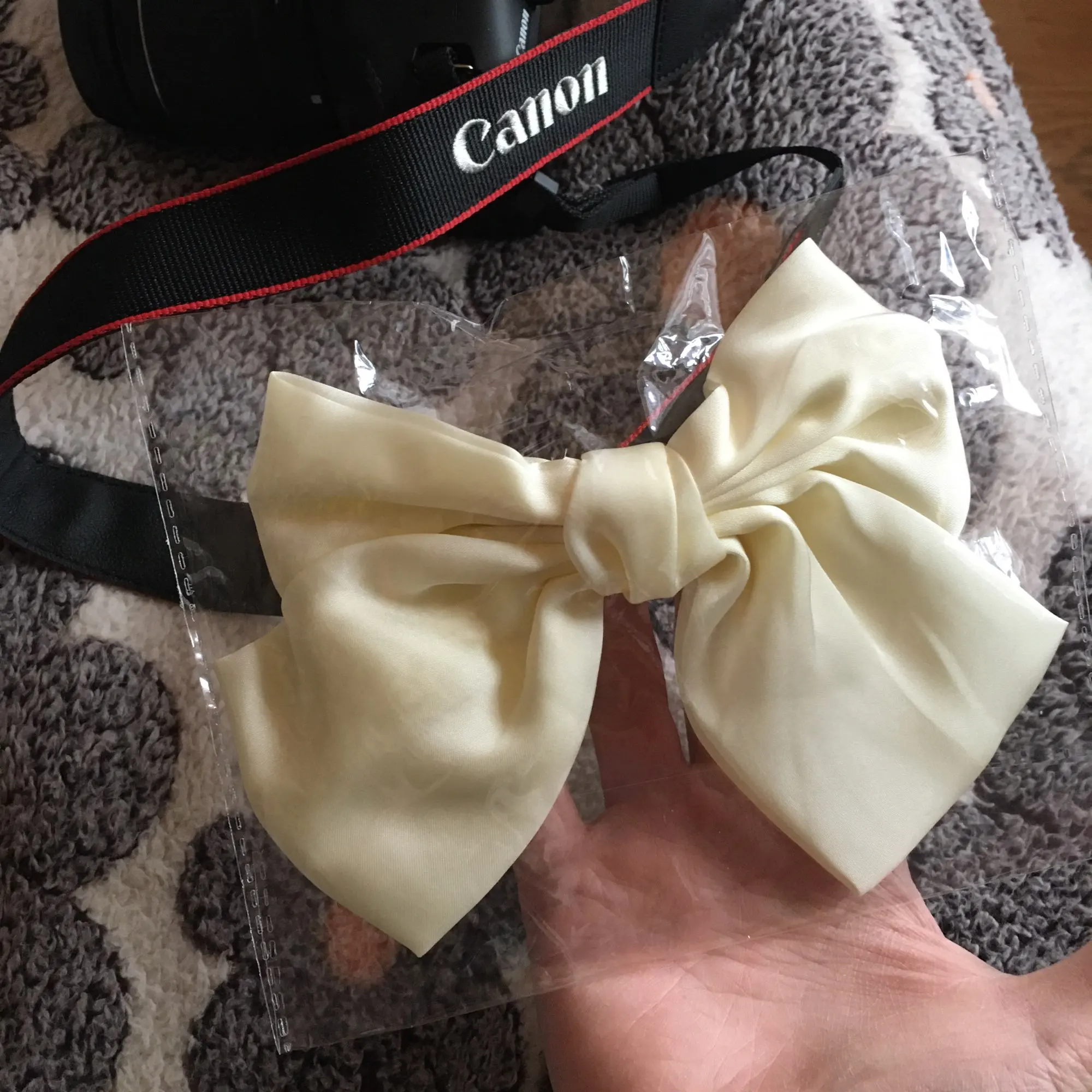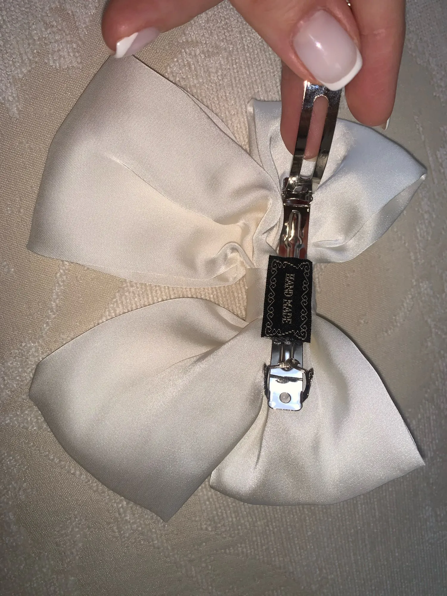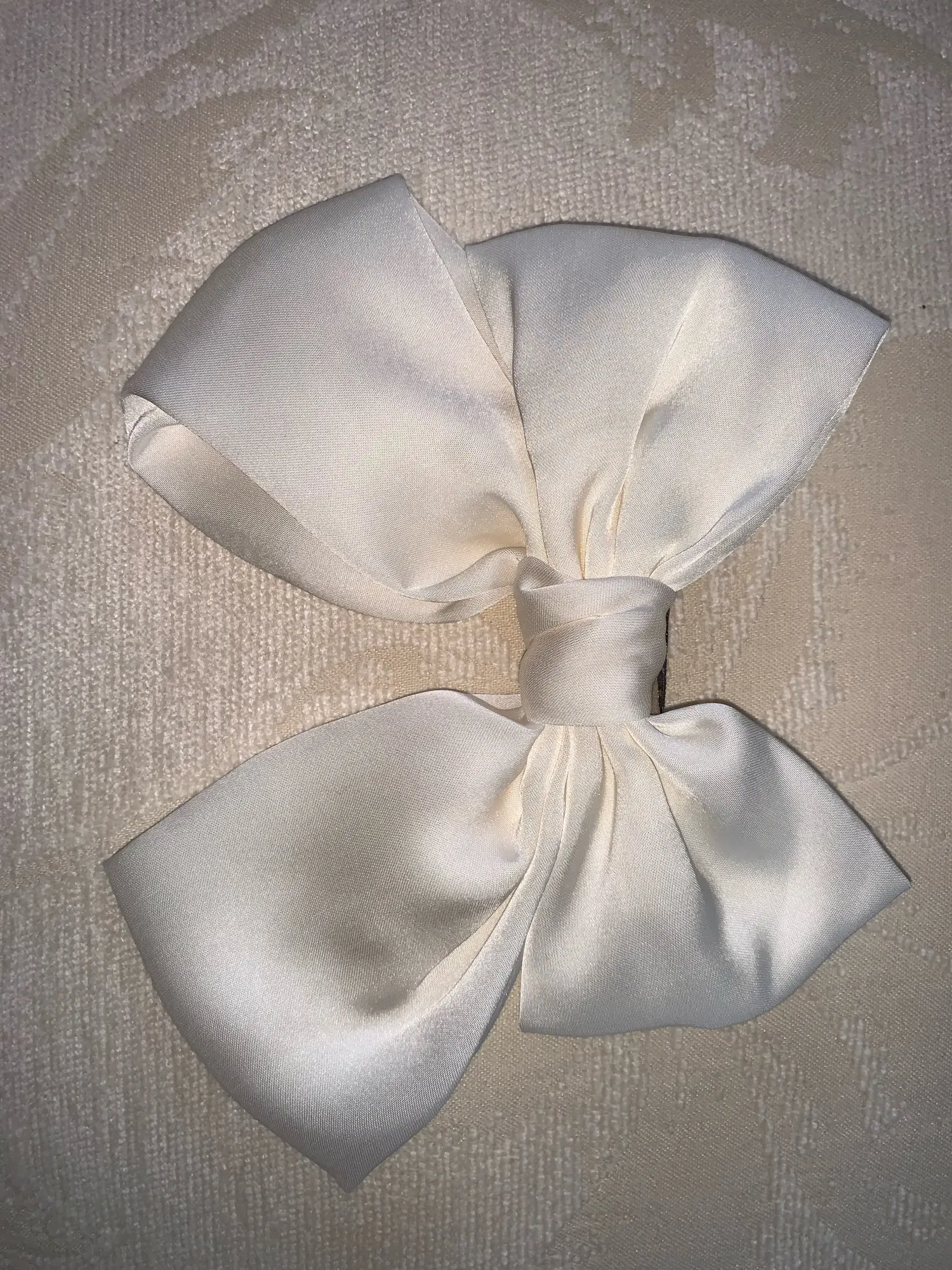 Бант красивый, цвет кремовый, размер самый оптимальный, ни большой, ни маленький. Буду носить с удовольствием. Спасибо.