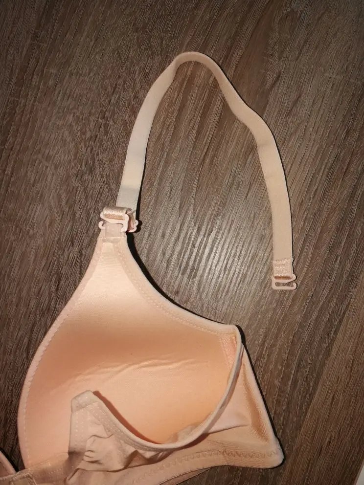 Цвет персиковый, материал синтетика. Косточек нет, пушапа тоже. Размер на русский В мал. Подойдет для охвата под грудью 75-80см