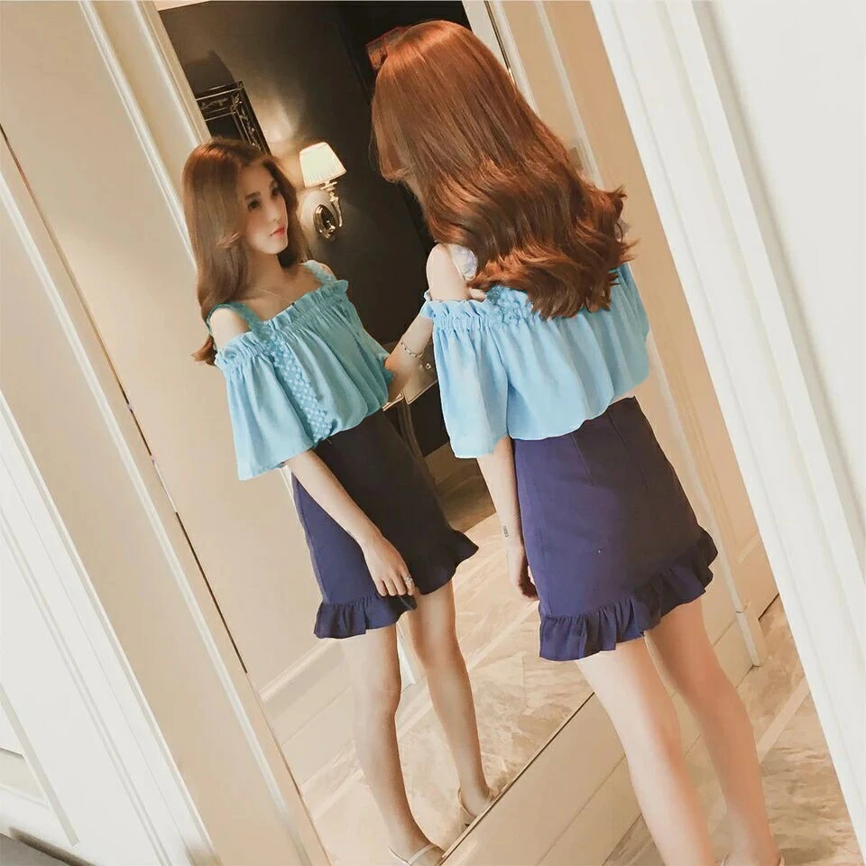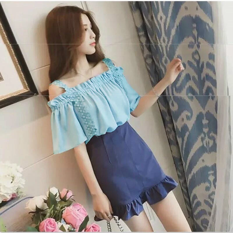 белого и синего цвета, женская одежда, шифоновые блузки, рубашки Новые летние кружевные женские повседневные топы с коротким рукавом и коротким рукавом 901F5