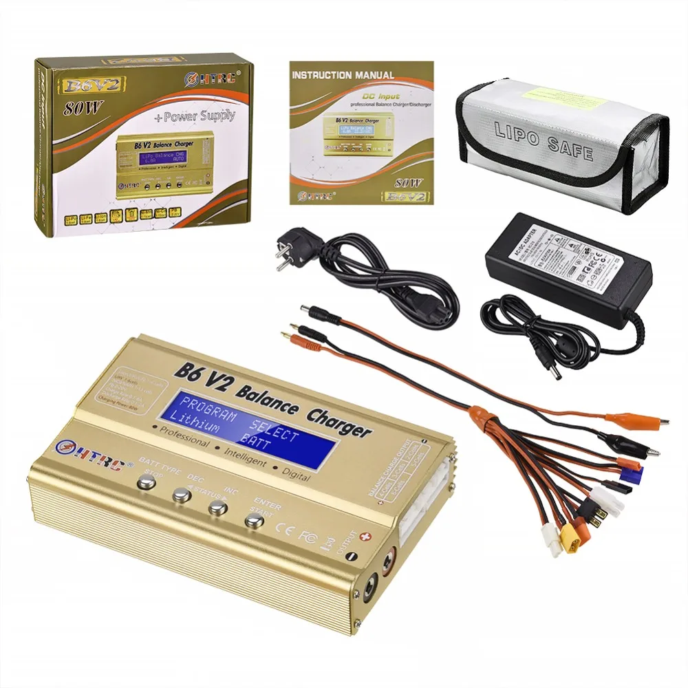 HTRC B6 V2 80 Вт Зарядное устройство для литий-полимерных аккумуляторов + набор зарядных кабелей 8 в 1 + адаптер переменного тока 15V6A + безопасная сумка для литий-полимерных аккумуляторов со светодиодной подсветкой 1S-6S