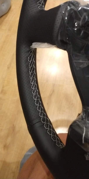 Сшитый вручную черный чехол рулевого колеса автомобиля из искусстве...