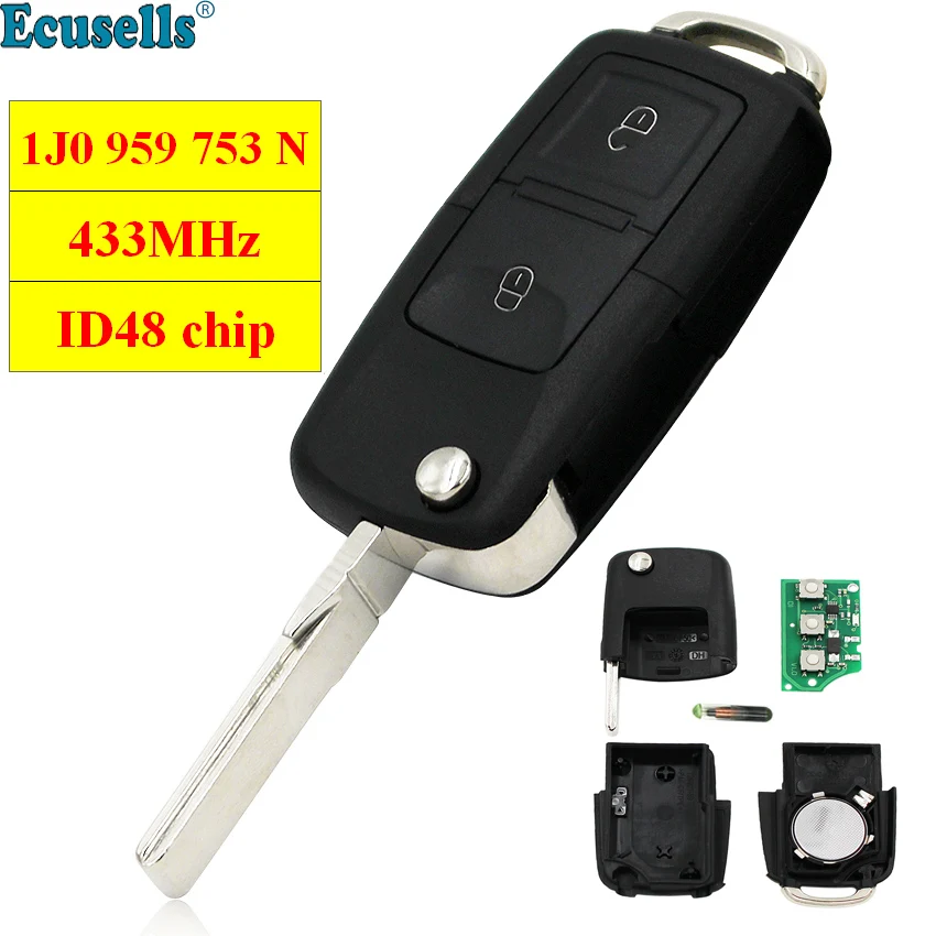Складной дистанционный ключ 2 кнопки 433 МГц для Volkswagen 1J0 959 753 N с чипом ID48