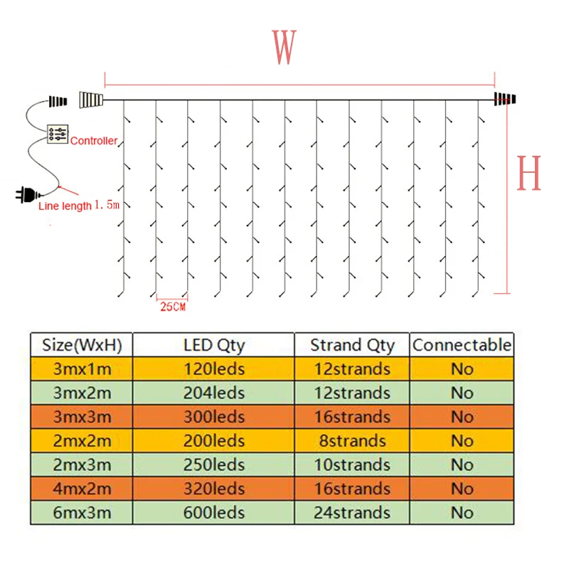 Примечание: 3 м x 1 м/2 м x 2 м/4x 2 м/3 м x 3 м(Не включая свинцовый провод)Светодиодный: 120 светодиодный s(3x1 м) /240 светодиодный s(3x2 м) / 320 светодиодный s(4x2 м)/300 светодиодный s(3x3 м)/300 светодиодный s(3x2,5 м) / 600 светодиодный s(3x6 м)Цвет излучения: белый/теплый белыйВилка электрическая: 110 В штепсельная вилка стандарта США/220 В штепсельная вилка европейского стандарта/220 В штепсельная вилка стандарта Австралии для покупателя стандарта Австралии и Новой ЗеландииРежим контроллера: 8Подводящий провод 1,5-2 м
