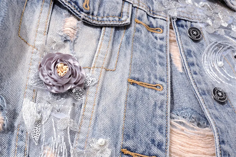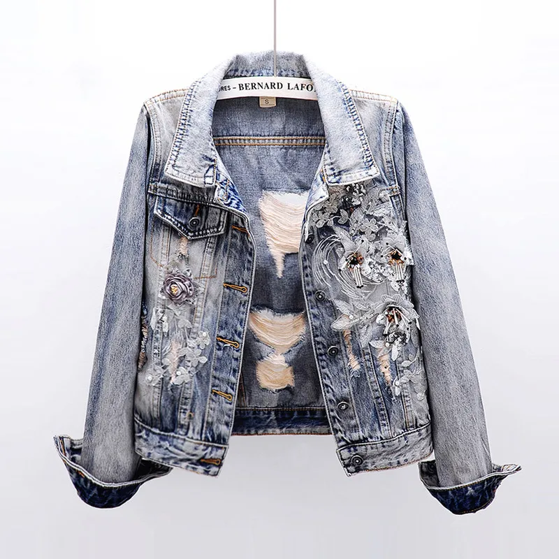 Рваная джинсовая куртка, новинка весны 2019, модные женские куртки, короткая куртка с цветочной аппликацией и длинным рукавом, свободная джинсовая куртка большого размера