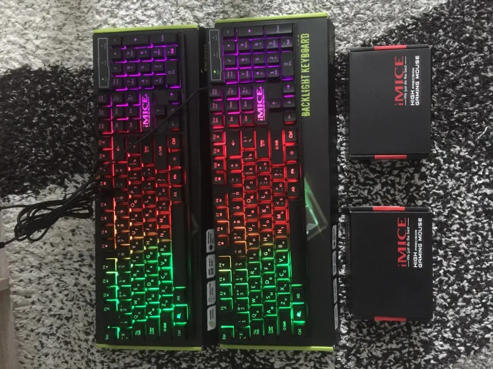 Товар пришёл целым не смотря на ужасное состояние коробок, клавиатура светит ярко меняет цвета, так же можно поставить какой то определённый цвет на свой выбор, к сожалению про мышку так не скажу да она без шумная как и за рекомендовал продавец, но цвета ты не меняешь сам, выбор цвета по ней тебе не предоставлен и светит она так себе, и там есть регулятор движения стрелочки, мышки по экрану это здорово в целом товар понравился пришёл быстро примерно + - 2 недели рекомендую.