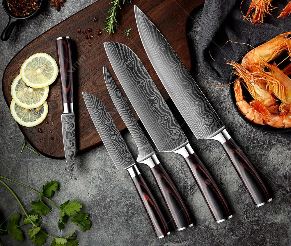 Красивый узор: специальное лезвие с волнистым узором особенно и поразительно (кухонные ножи из нержавеющей стали 7Cr17, а не настоящий Дамаск).