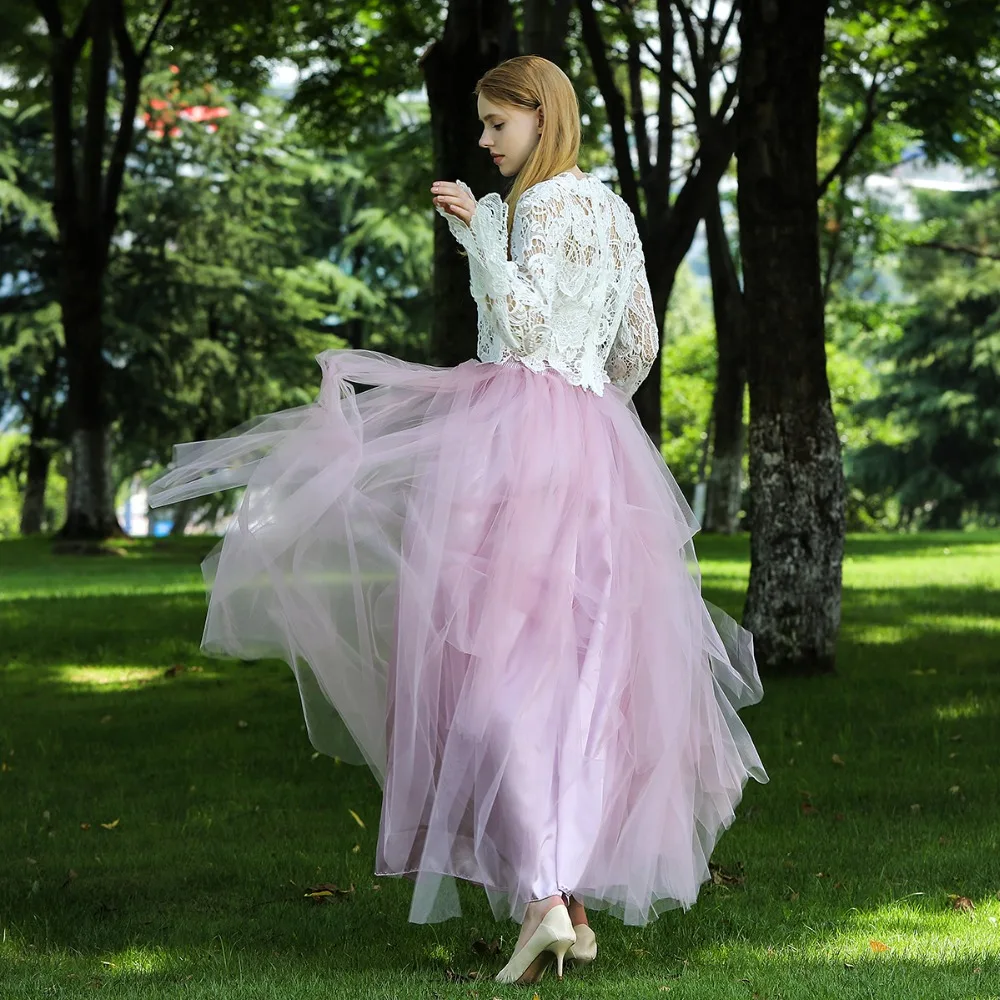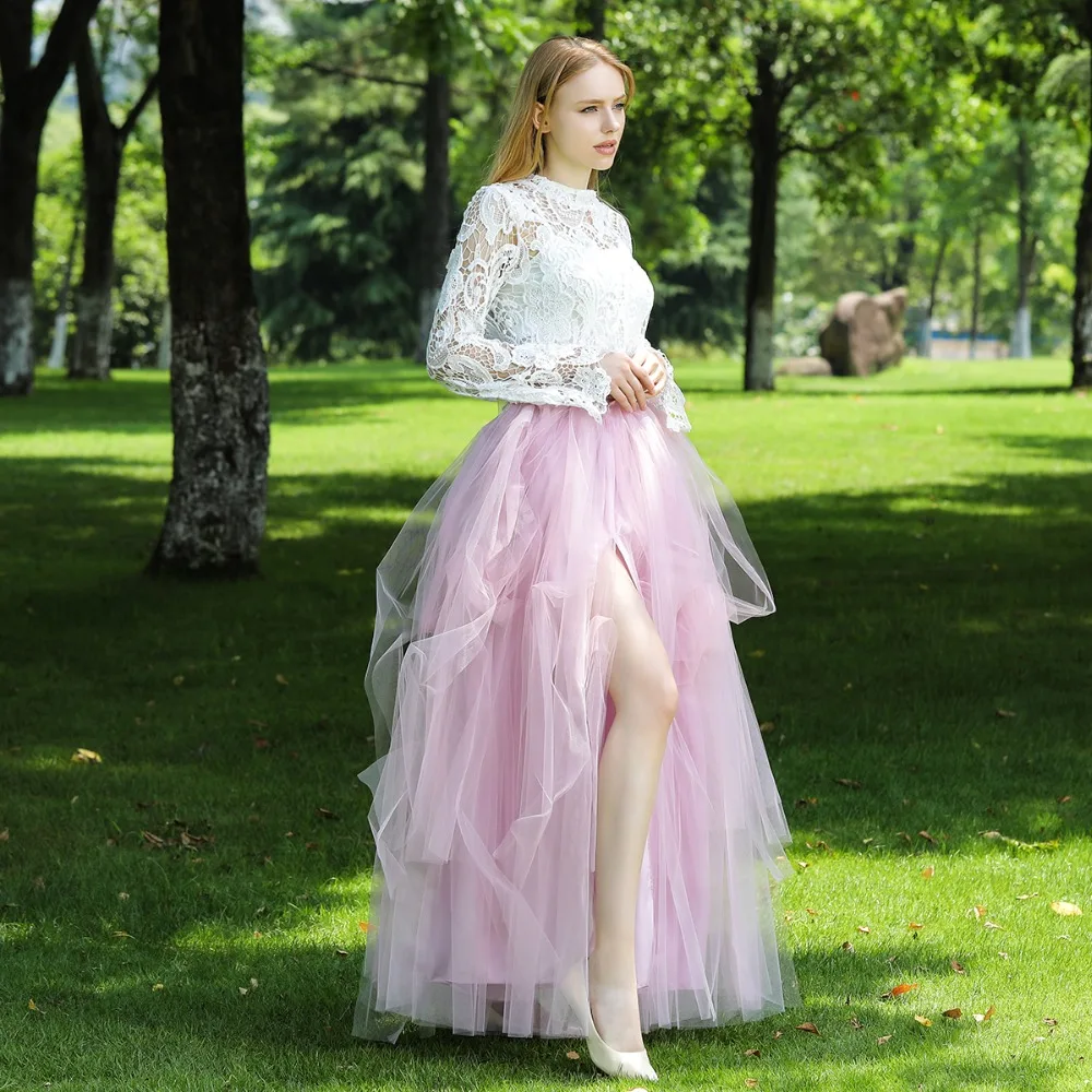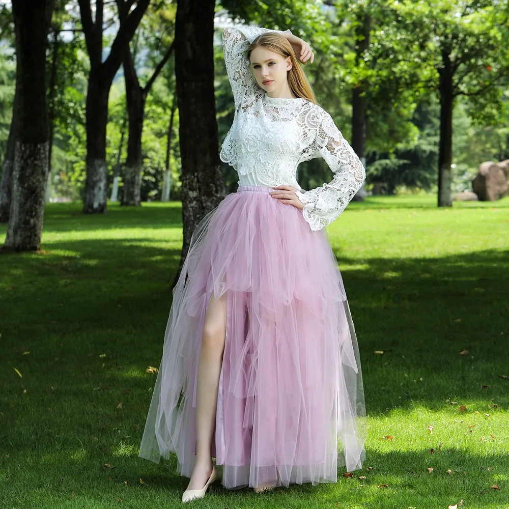 Новый дизайн, фатиновые юбки, женская мода, эластичная высокая талия, сетчатая сексуальная юбка-пачка с разрезом, гофрированные длинные юбки, длинная юбка