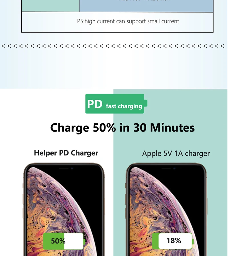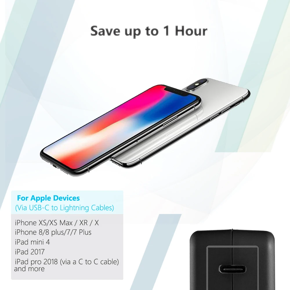 Вспомогательное Зарядное устройство USB C PD полностью совместимо с передовой технологией PD 30 Вт и обеспечивает быструю скорость зарядки (5 В/3A, 9 В/3A, 12 В/2.5A,15 в 2A). Сопряжение с оригинальным usb-кабелем Apple C и lightning, ваш iPhone 8, iPhone 8 Plus, iPhone X, iPhone Xs, iPhone Xs Max может быть полностью заряжен в течение 100 минут, И 12 "Macbook в течение 2 часов.