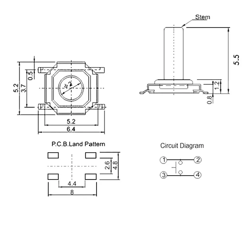 100 шт.лот 5,2*5,2*5,5 мм 12 В а 4-контактный SMT кнопочный переключатель, металлический тактильный микропереключатель, медный прерыватель