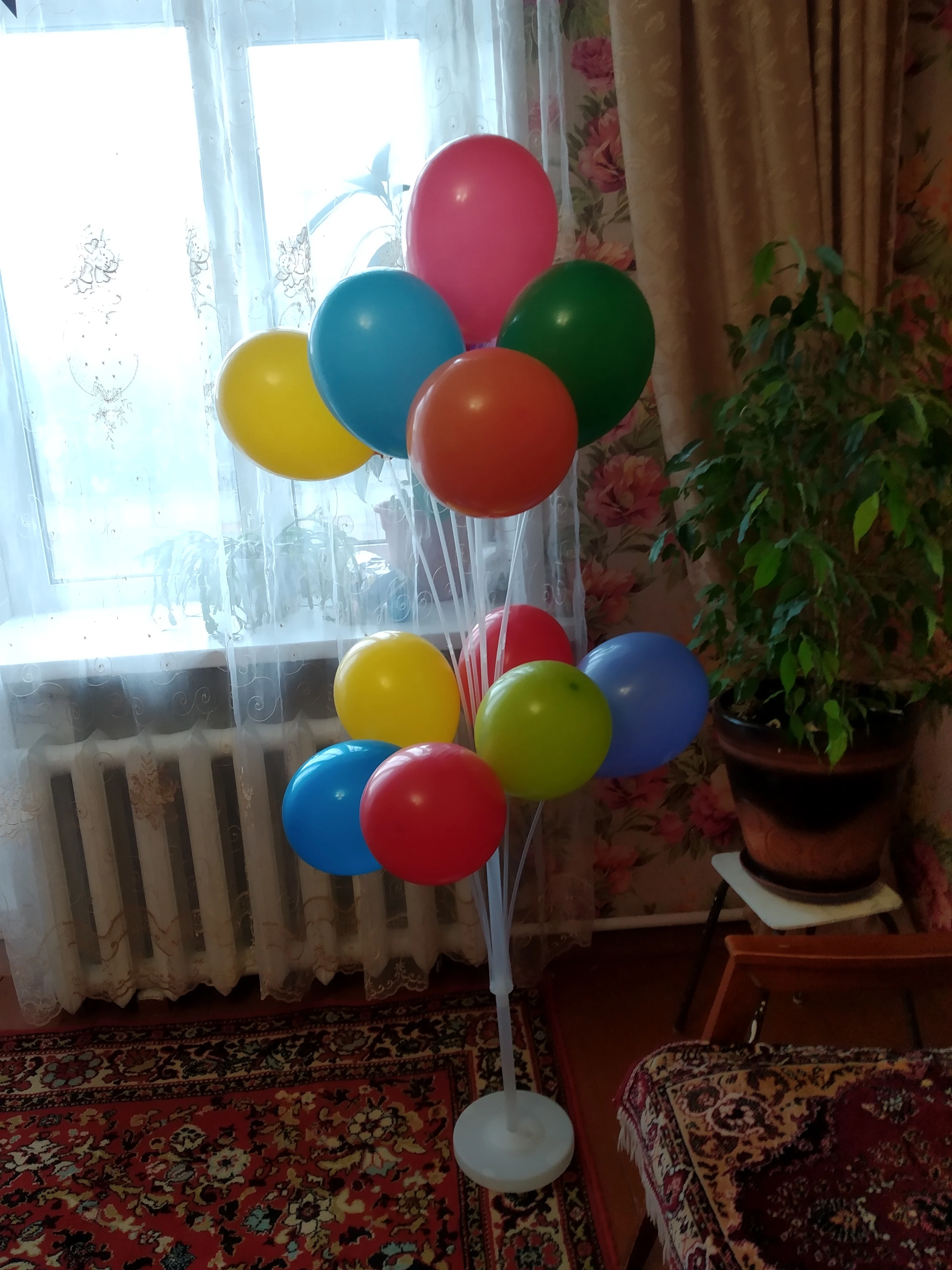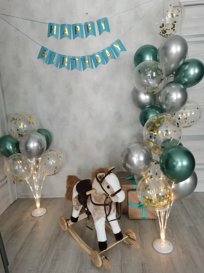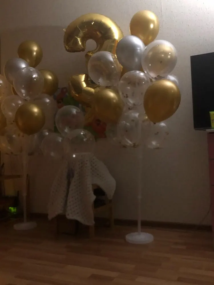 Заказала 13 ноября пришла 9 декабря.Точно к Дню рождения пришла . Ждала раньше ее судя по отзывам. Боялась не успеет. Но все хорошо. В подставку налила воды для устойчивости. Выливается она оттуда кстати плохо И при транспортировки у меня одна пробочка завалилась внутрь подставки, ну я выкрутилась взяла пробочку от баночки с глицерином. Лучше бы их отдельно от подставок клали. вешала по 3 шарика вполне достаточно нам было. Хотя можно и по 6шт. Обмотала гирляндой и вот такая красота. Трубочек больше, чем положено. Будут как запасные. Классная вещь, не пожалела. Теперь не приходится шарики завязывать.Намотал их и красотаДаже их можно потом повторно использовать. Снял, сдул, убрал.