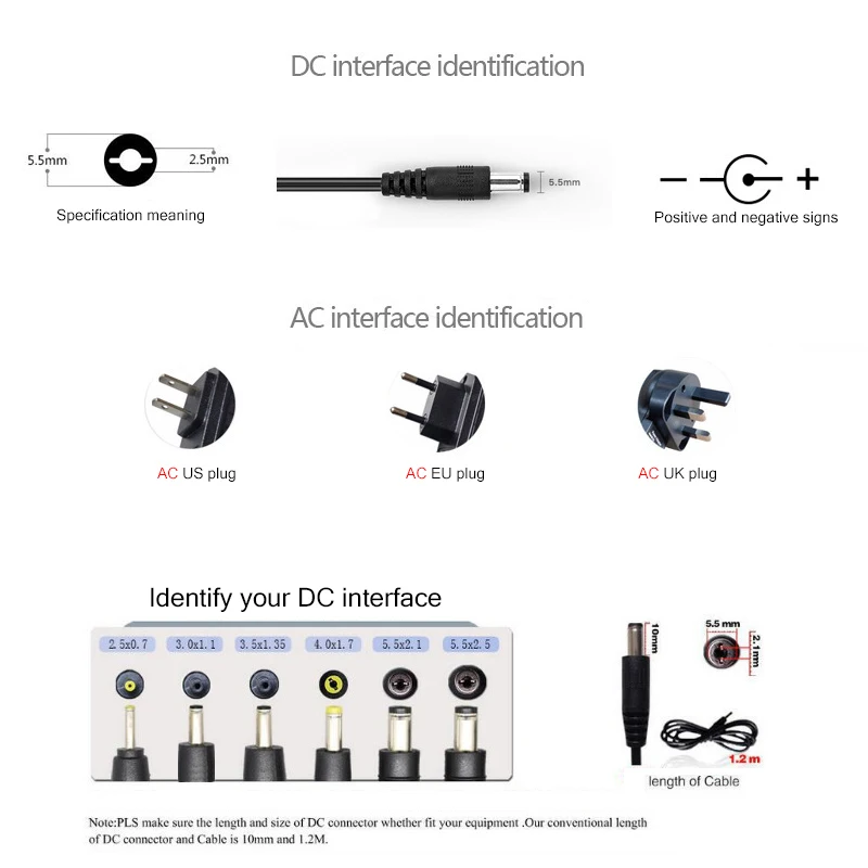 Модель штекера постоянного тока: 2,5*0,7 мм/3,0*1,1 мм/3,5*1,35 мм/4,0*1,7 мм/5,5*2,1 мм/5,5*2,5 мм