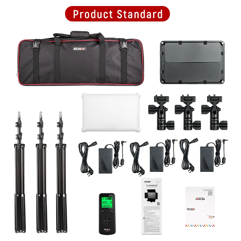 3 x VL-S192T светодиодный светильник для видеосъемки3x2 м регулируемый светильник-подставка3 x кронштейн лампы3 белых фильтра3 x адаптер постоянного тока1 х пульт дистанционного управления1 х сумка для переноски(Примечание: аккумулятор не входит в комплект)