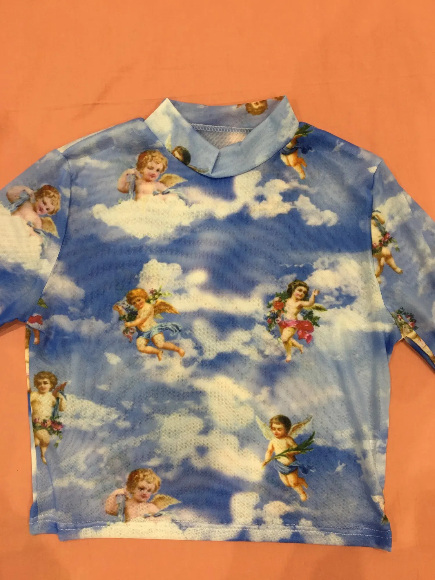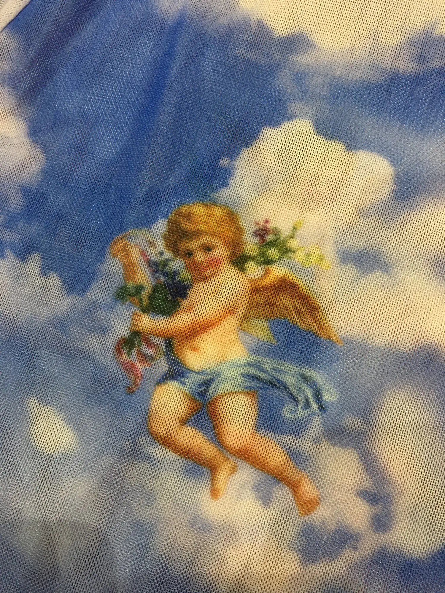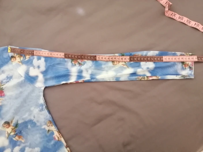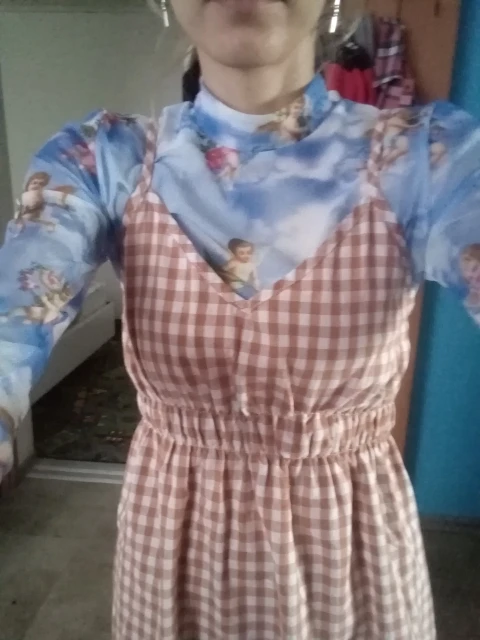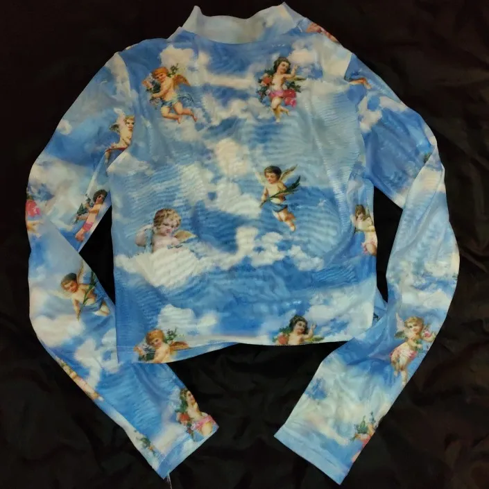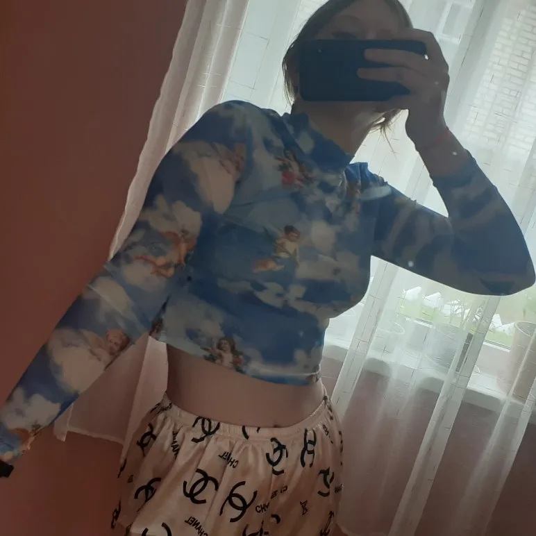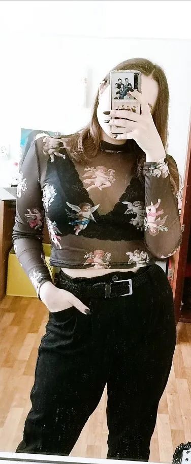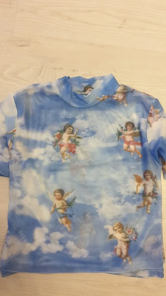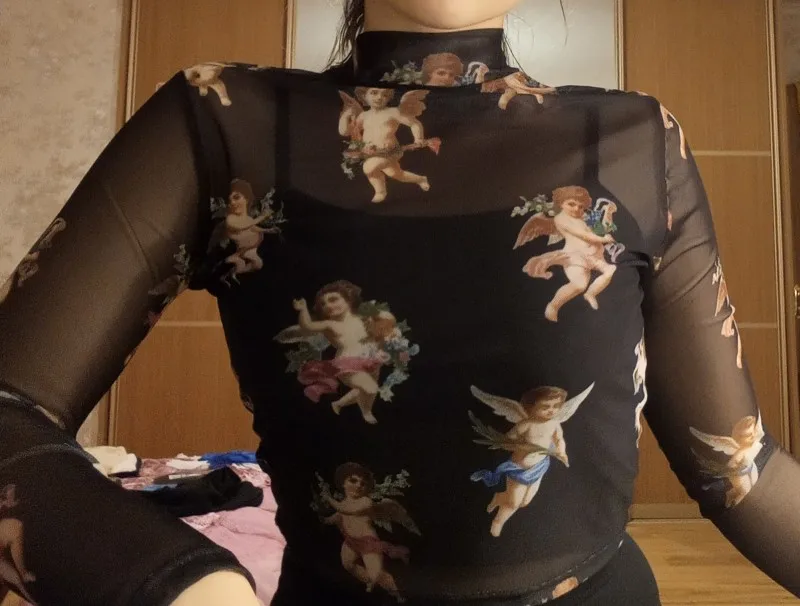 За свои копейки кофта хорошенькая. С виду аккуратный пошив, но если приглядеться, то можно увидеть, что строчки, по крепости своей, слабоваты, например, на горловине. А так, в целом, неплохая кофта за свои несчастные 120 рублей (я брала по скидке). Запах имеется, но думаю, что после полоскания в машинке, на 30 градусах и с кондиционером, весь запах исчезнет. Я ношу размер S-M, но, по совету комментаторок выше, кофту взяла L, берите, не пожалеете. Она очень маломерит. Рукава тянутся неплохо, аккуратно сидит на теле, не колется, не чешется. Все комфортно и мягко. Рукава длинные, до запястий, сама кофточка длиной до талии. Да, она короткая. Я бы не сказала, что она ну прям уж прозрачная. Все, в принципе, прилично. Рисунок четкий. Ангелы просто толстые милые пупсы с нормальными личиками. Ничего нигде не расплывается. Вполне румяные детки. В общем, как я и сказала ранее, за свои деньги хорошая кофта!