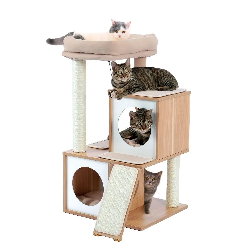 ·Сочетание традиционного и современного: В отличие от традиционного кошачьего дерева, основная часть этой кошачьей башни, покрытой поверхностью древесины, делает ее выдающейся и выглядит чистой и современной. Все коврики снимаются и моются, их легко чистить и создавать комфортные условия для ваших кошек. В то время как большой гамак из мягкого плюша обеспечивает очень теплую и уютную кровать для ваших кошек.