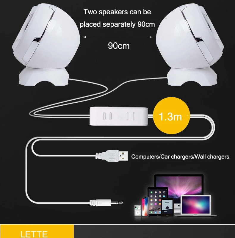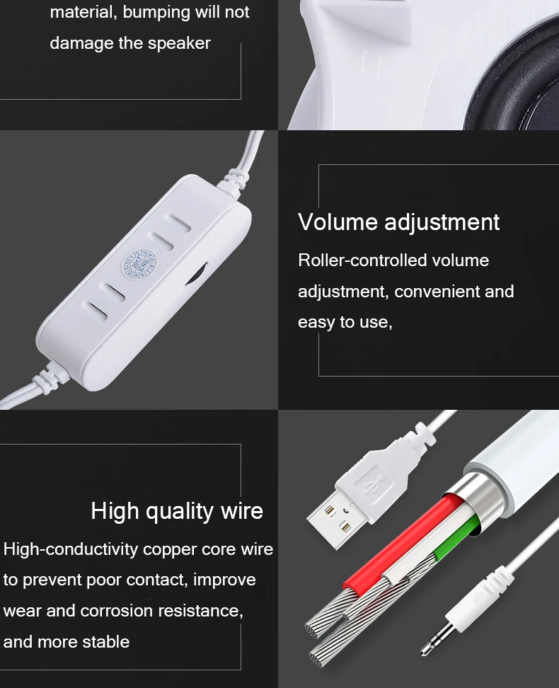 1. Высококачественный провод:Провод с медным сердечником высокой проводимости предотвращает плохой контакт, улучшает износостойкость и устойчивость к коррозии и обеспечивает более стабильную работу.2. Регулировка громкости:Роликовый регулятор громкости, удобный и простой в использовании.3,2 x 4Ω 3 Вт высококачественные рожки:Звук мягкий, качество звука чистое.4. Превосходные материалы:ABS литья под давлением материал, bumping не повредит динамик.5. Простой дизайн, простота установки и использования:Два динамика можно разместить отдельно 90 см, длина кабеля 130 см.
