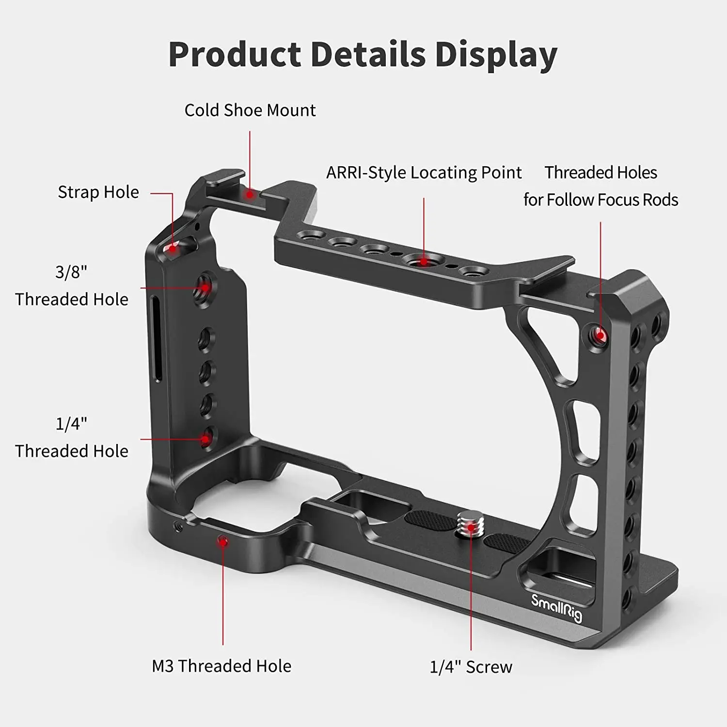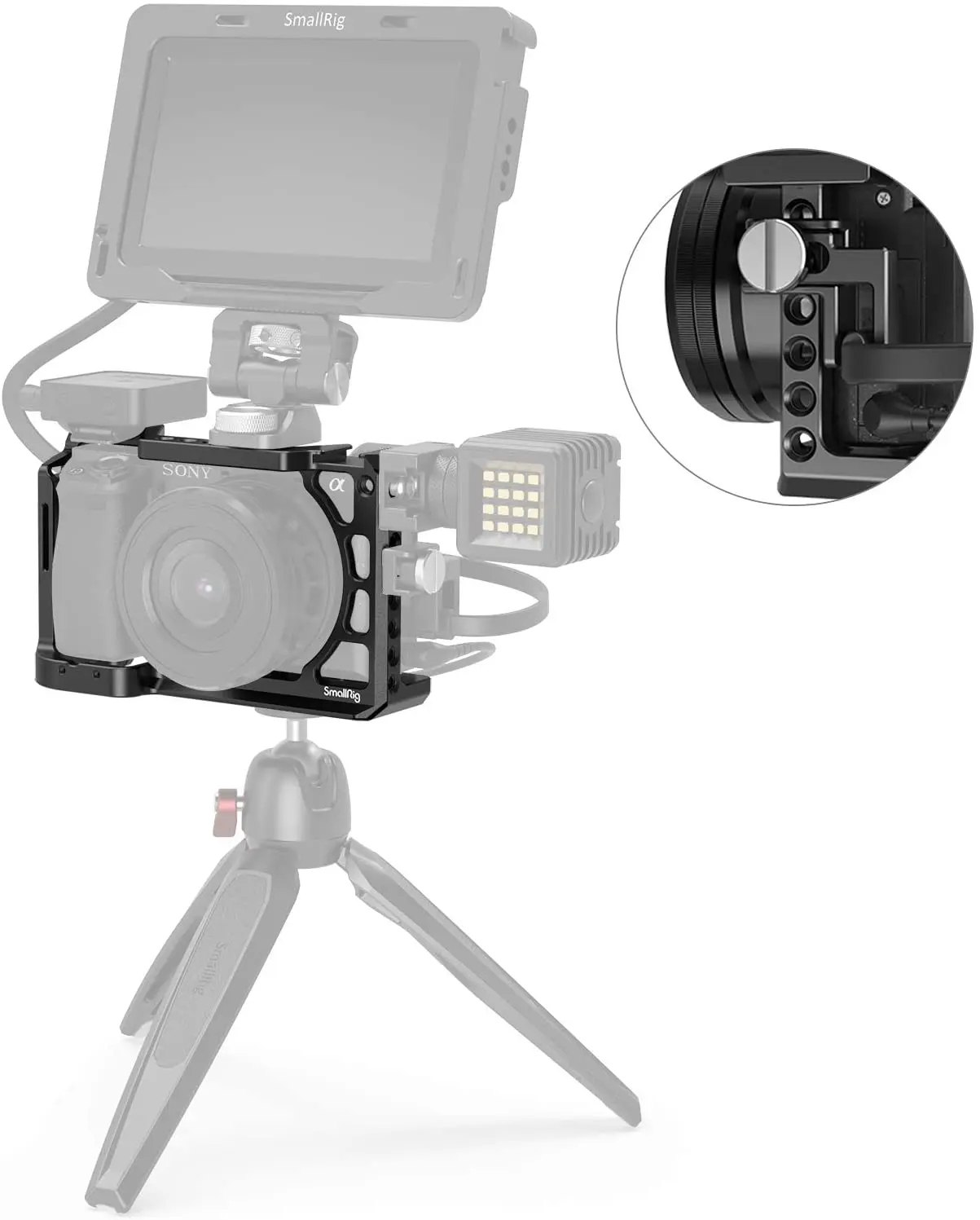 Клетка SmallRig для камеры Sony A6100/A6300/A6400/A6500 2310 Предназначен для обеспечения защиты и крепления аксессуаров для вашей камеры. Клетка крепится к камере с помощью одного 1/4 "-20 в нижней части и одного винта m2, 5 с правой стороны, чтобы предотвратить скручивание. Имеет несколько отверстий с резьбой 1/4-20 дюймов, ARRI 3/8-16 установочных отверстий для крепления Крепление монитора 2903, Верхняя мини-ручка 2771 или другие аксессуары для создания полного комплекта для видеопродукции. В верхней части клетки есть два крепления для холодного башмака для подключения микрофона или звукового приемника напрямую. Дно соединяется с Arca швейцарская тарелка для быстрой передачи на штатив Arca. Встроенные Резиновые прокладки внизу защищают камеру от царапин. Кроме того, клетка поддерживает доступ к кнопки для камеры, портам и дверце аккумулятора. Встроенная отвертка с плоской головкой и шестигранным ключом находится внизу для быстрой сборки и разборки. Дополнительный кабельный зажим HDMI 1693 доступен отдельно для защиты порта HDMI. Вы также можете прикрепить отдельно Доступные Деревянная рукоятка APS2318 Или Силиконовая рукоятка 2788 Для удобного захвата.