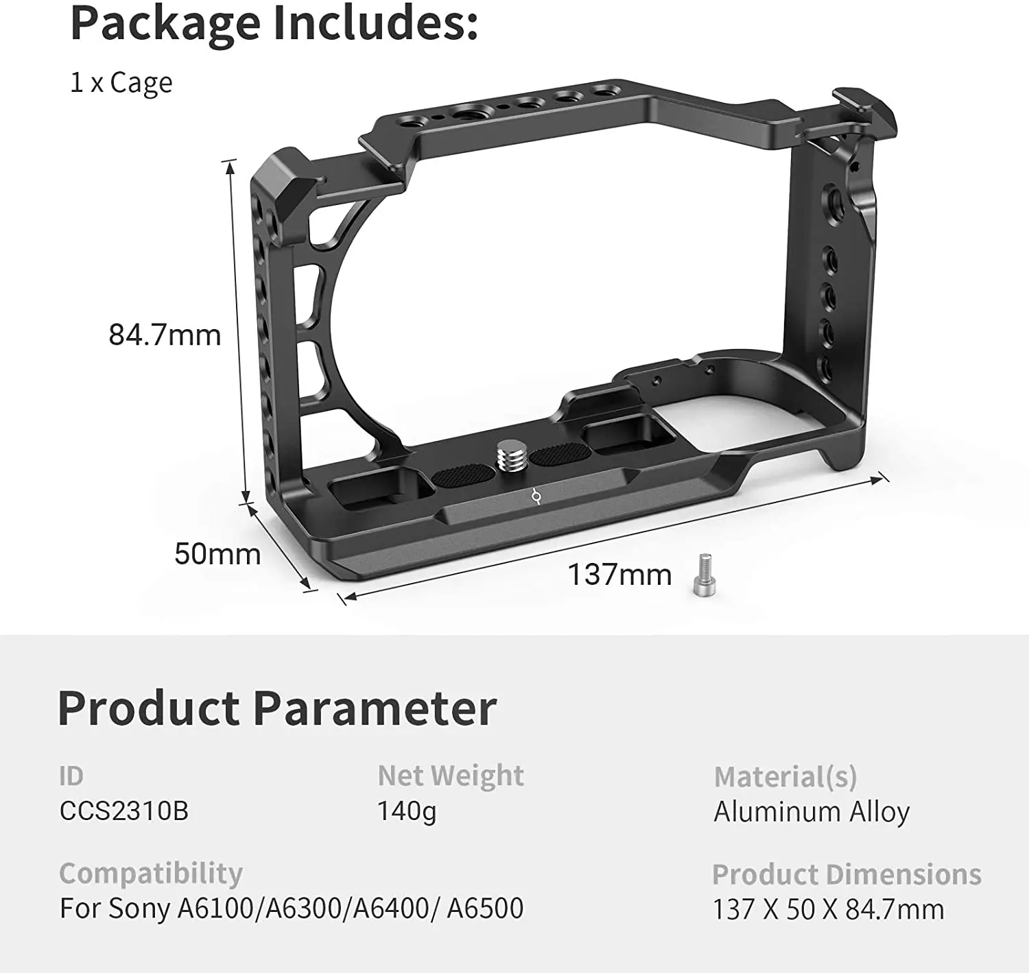 Ключевые особенности:1. Специально разработан для камер Sony A6100/A6300/A6400/A6500.2. Имеет резьбу 1/4-20 дюймов, установочные отверстия ARRI 3/8-16 дюймов и крепления для холодного башмака.3. Встроенная отвертка с плоской головкой и шестигранным ключом для быстрой сборки и разборки.4. Встроенная пластина типа Arca на дне.5. Блокирует камеру с помощью одного винта 1/4-20 дюймов и одного винта M2.5 сбоку, чтобы предотвратить скручивание.