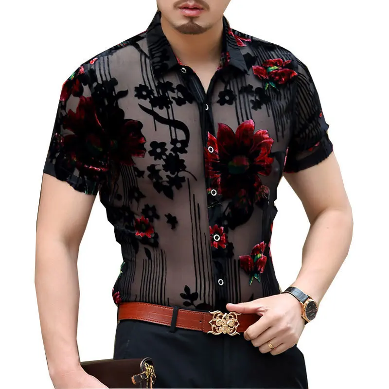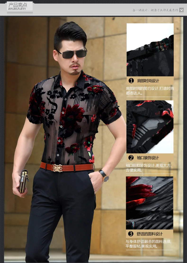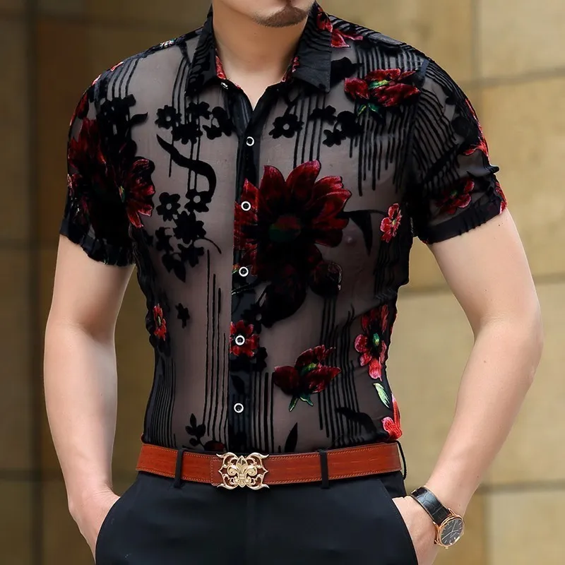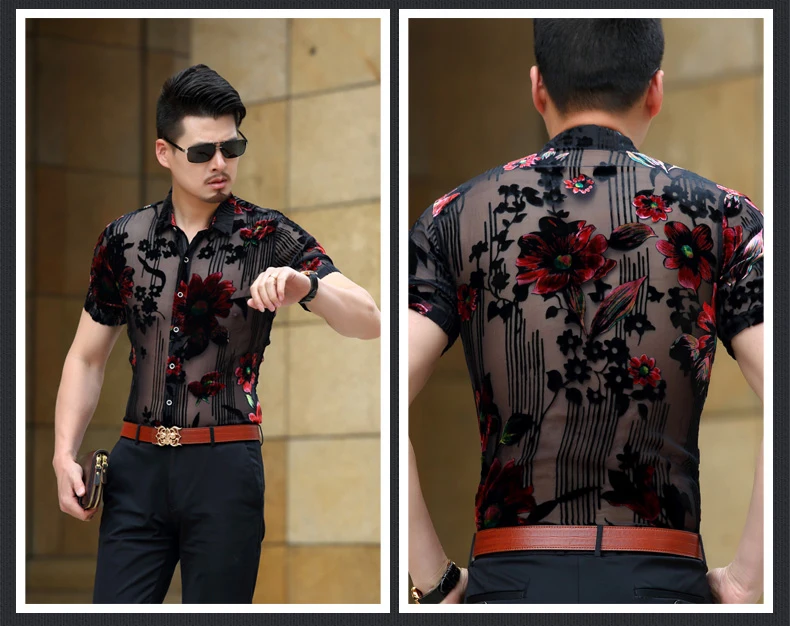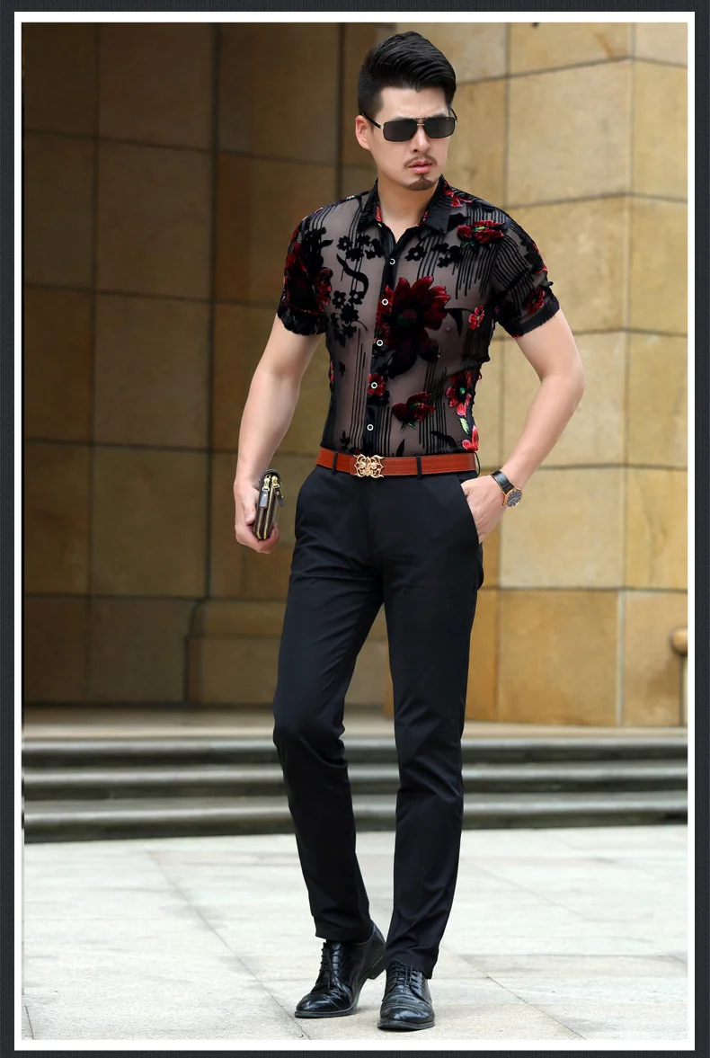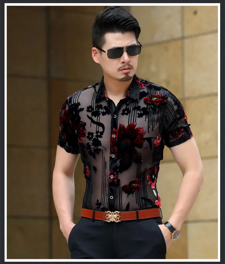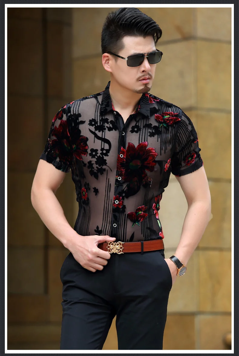 Мужская Клубная вечерние 2019, новая рубашка для диджея, выпускного вечера, сорочка с коротким рукавом, Мужская прозрачная Вельветовая рубашка с цветами, Мужская Прозрачная кружевная рубашка