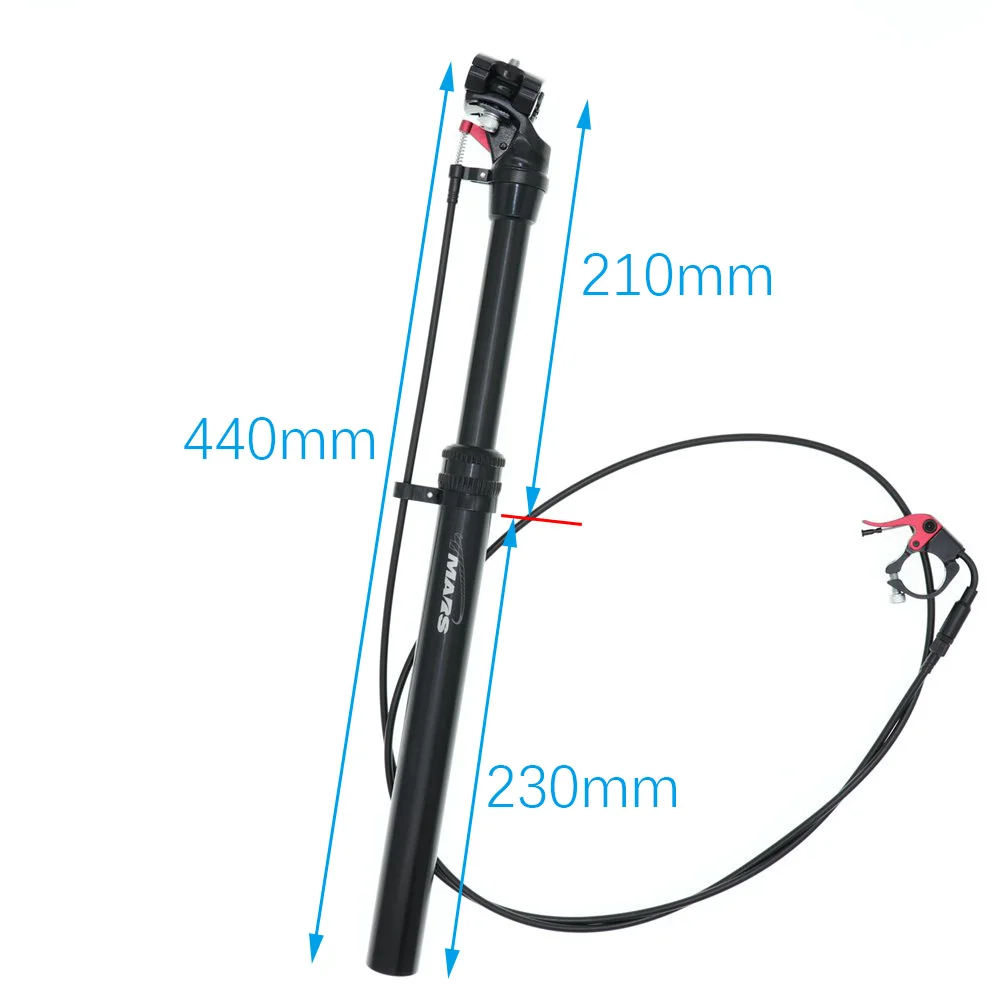 Это полностью механический Регулируемый подседельный штырь, введенный Tmars. Путешествие 110 мм, стоп-положение 110 мм, 55 мм и 0 мм. Он останавливается только на этих 3 позициях. Материал-алюминиевый 6061 авиационного уровня. Он прочный и простой в обслуживании, потому что он механический. Не нравится давление воздуха и гидравлика. Особенности: Бренд: Tmars Модель: проводной пульт дистанционного управления/ручное управление Расстояние в пути: 110 мм (остановка на 110 мм, 55 мм, 0 мм) Диаметр: 27,2 мм, 28,6, 30,1 (30,0), 30,4, 30,8 (30,9), 31,6 Длина: 440 мм Вес: 535 г (Ручное управление), 580 г (управление кабелем) Цвет: черный глянцевый, анодированный Тип: механический и пружинный