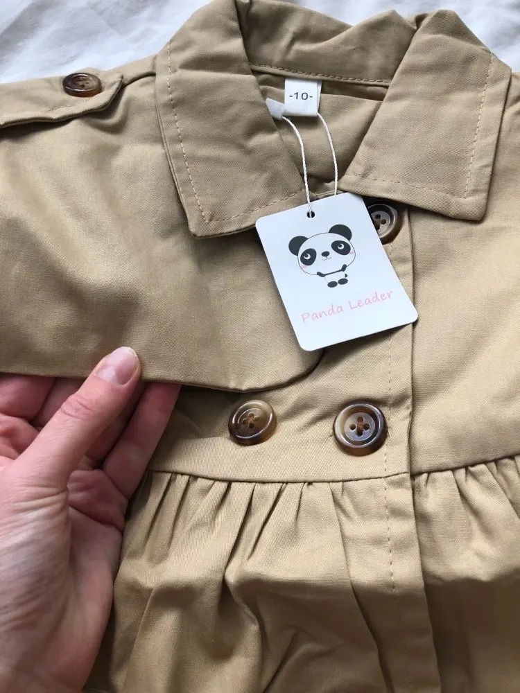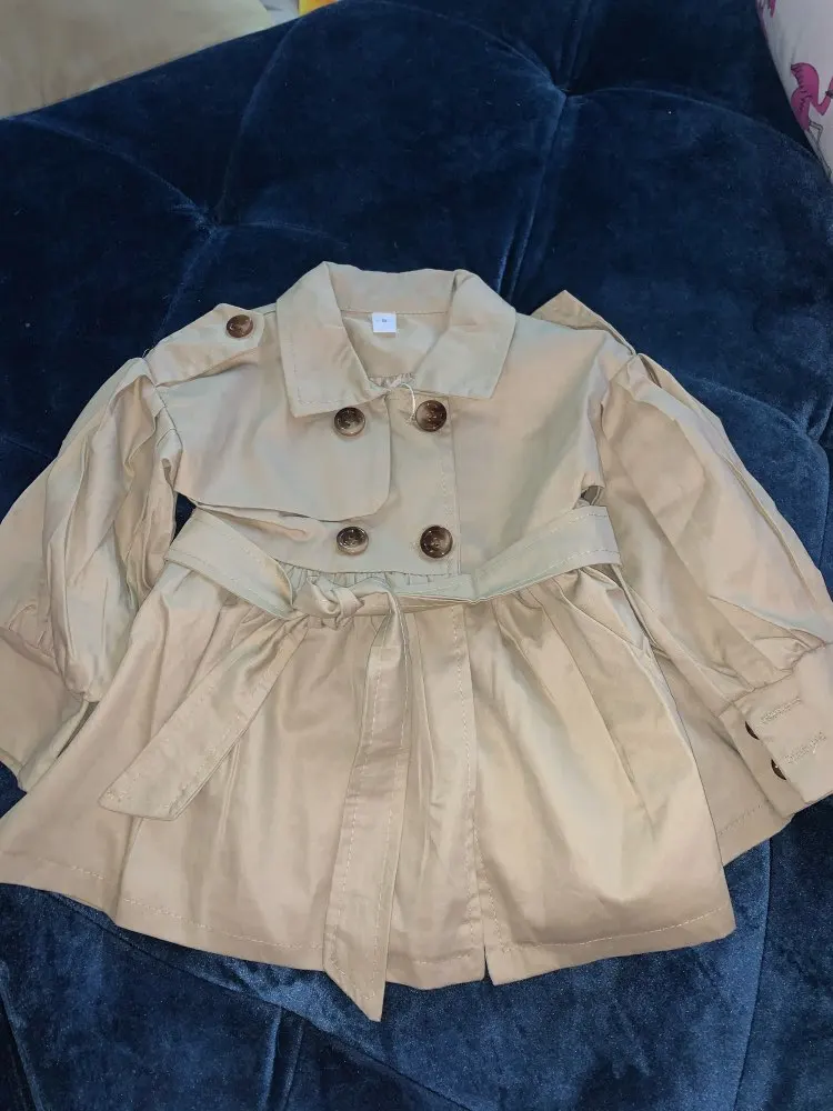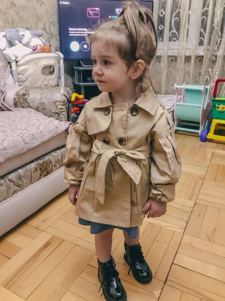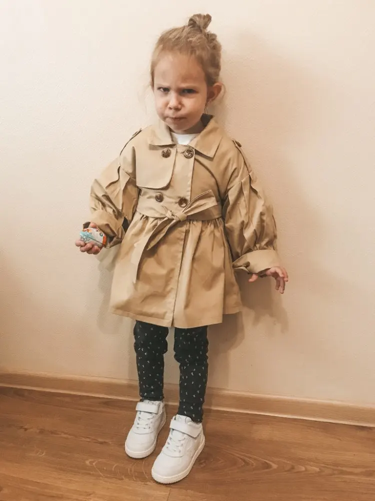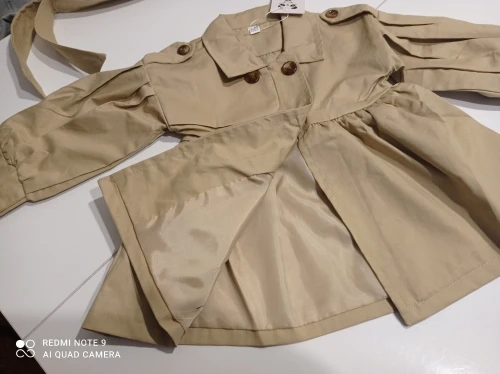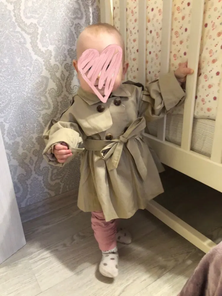 Классный тренч, смотрится красиво) на рост 90см, 2г5м, я взяла дочке 4т немного на вырост...(но на биррке на шее написано 12) Единственное что смущает это широкие манжеты, они даже на мою руку будут велики. А так всё качественно, сшито хорошо, пуговки красивые, цвет соответствует, ниток и запаха нет.