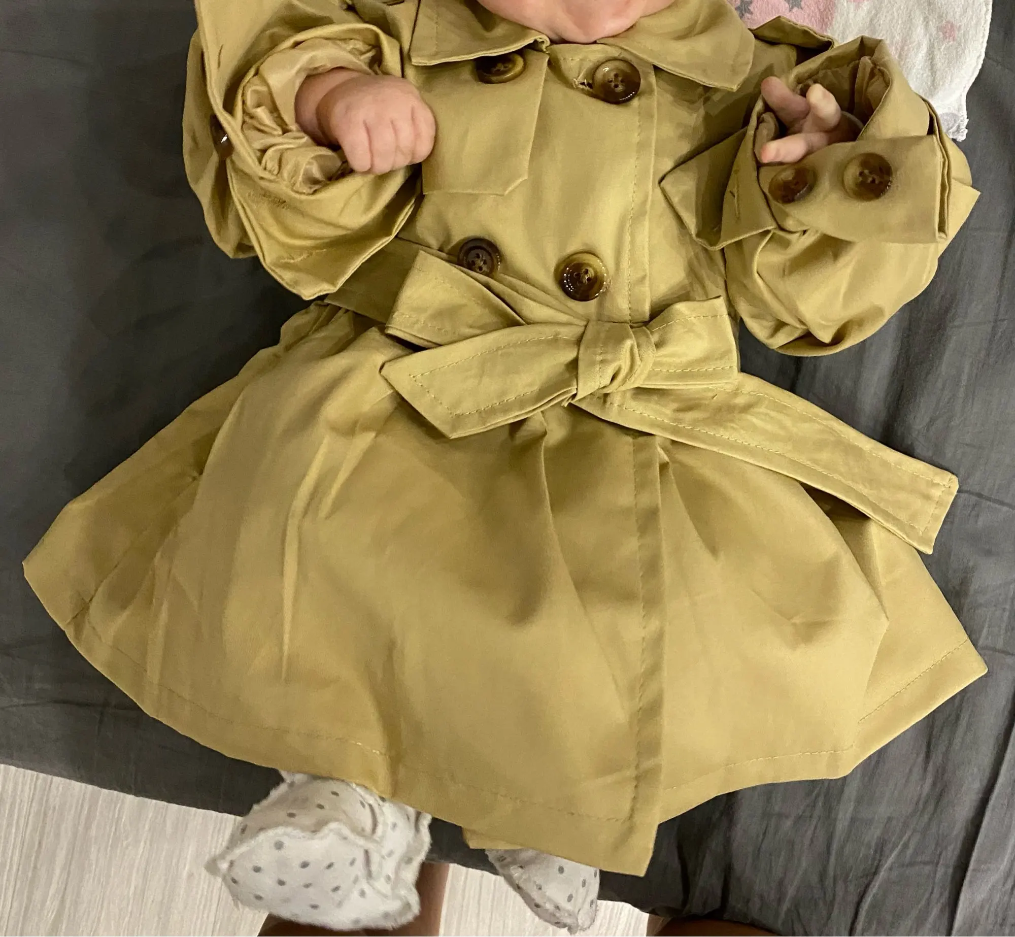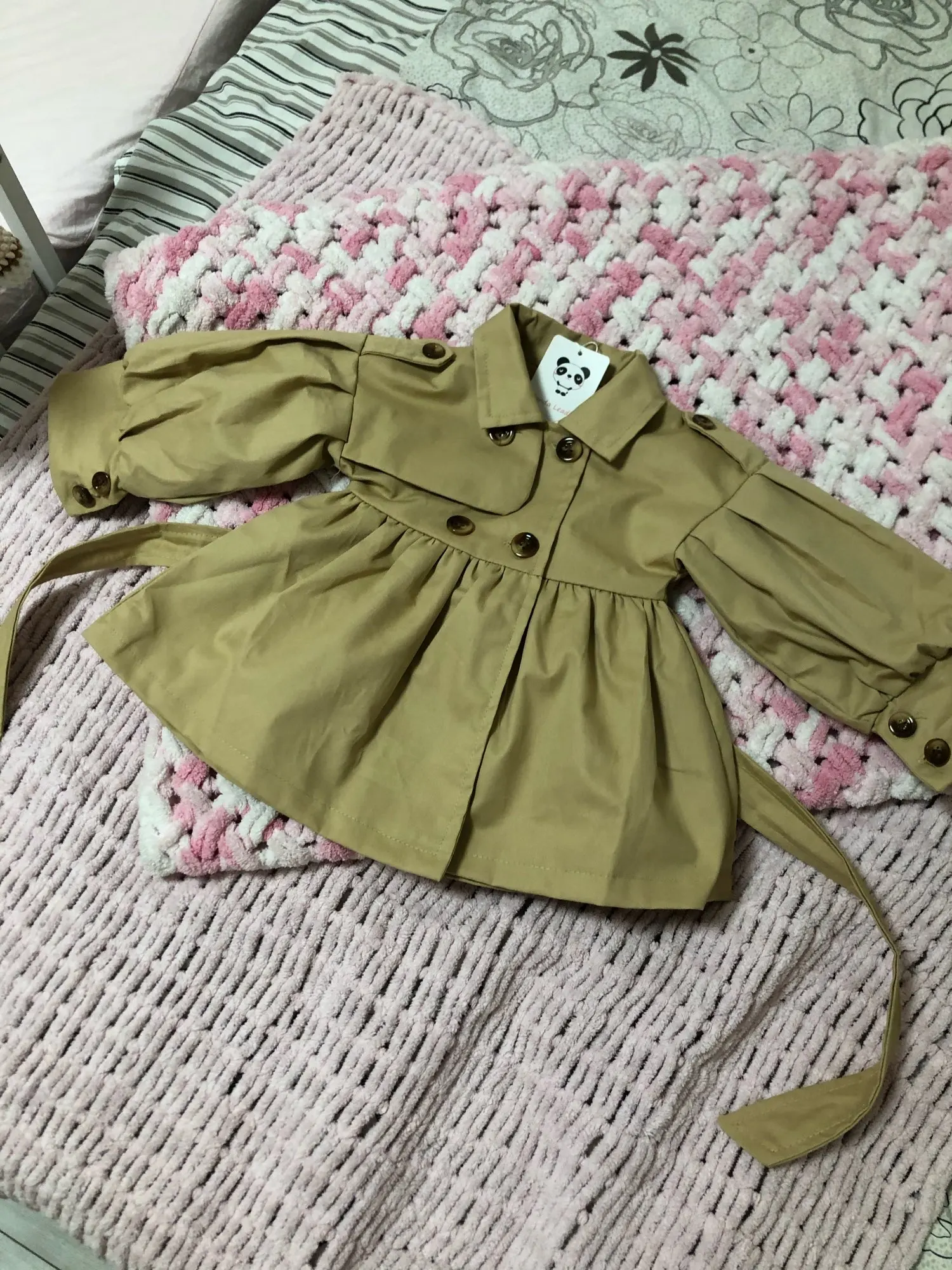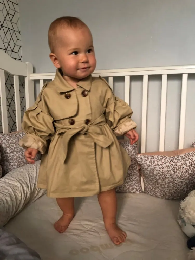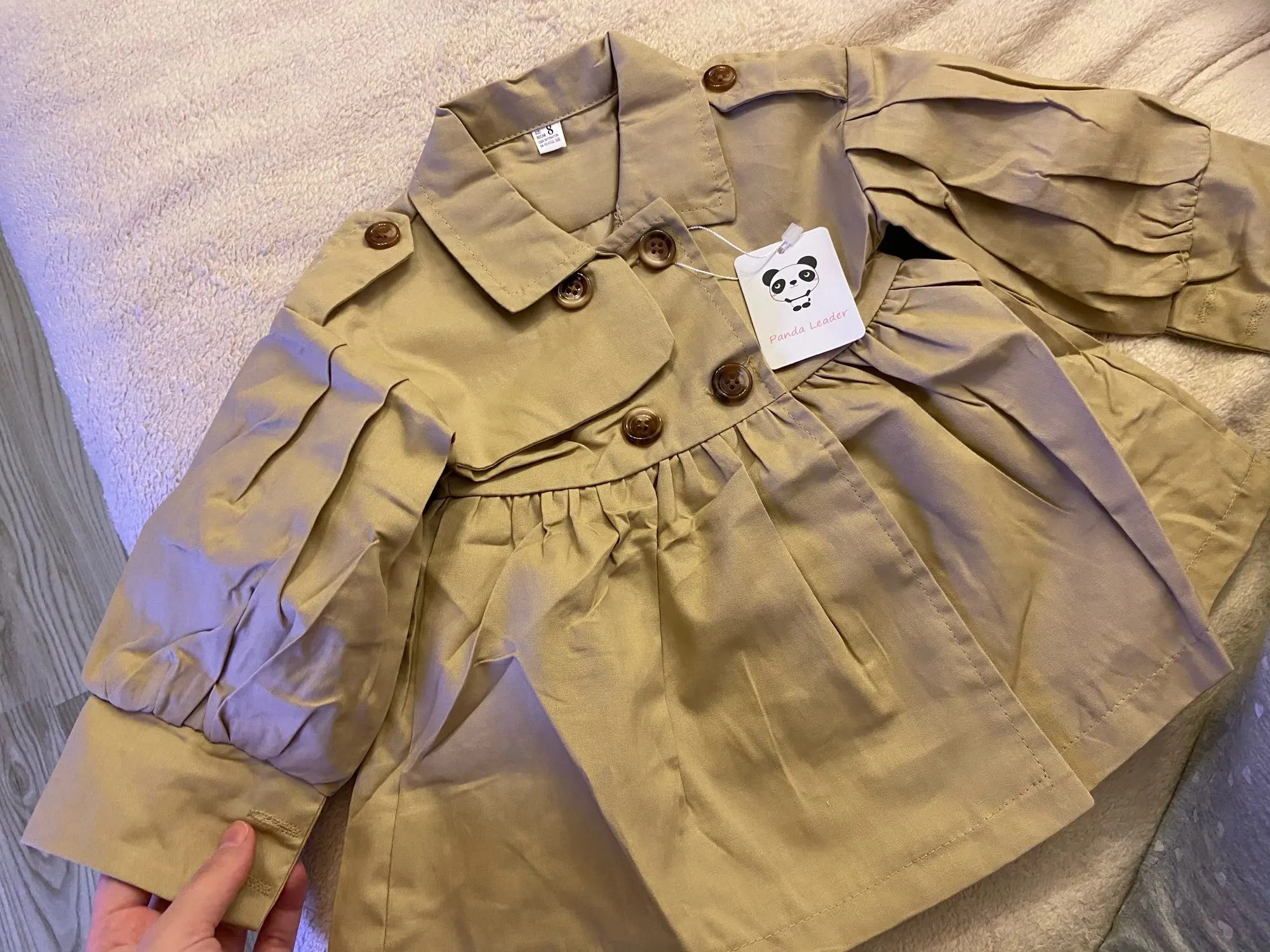 Классный тренч, смотрится красиво) на рост 90см, 2г5м, я взяла дочке 4т немного на вырост...(но на биррке на шее написано 12) Единственное что смущает это широкие манжеты, они даже на мою руку будут велики. А так всё качественно, сшито хорошо, пуговки красивые, цвет соответствует, ниток и запаха нет.