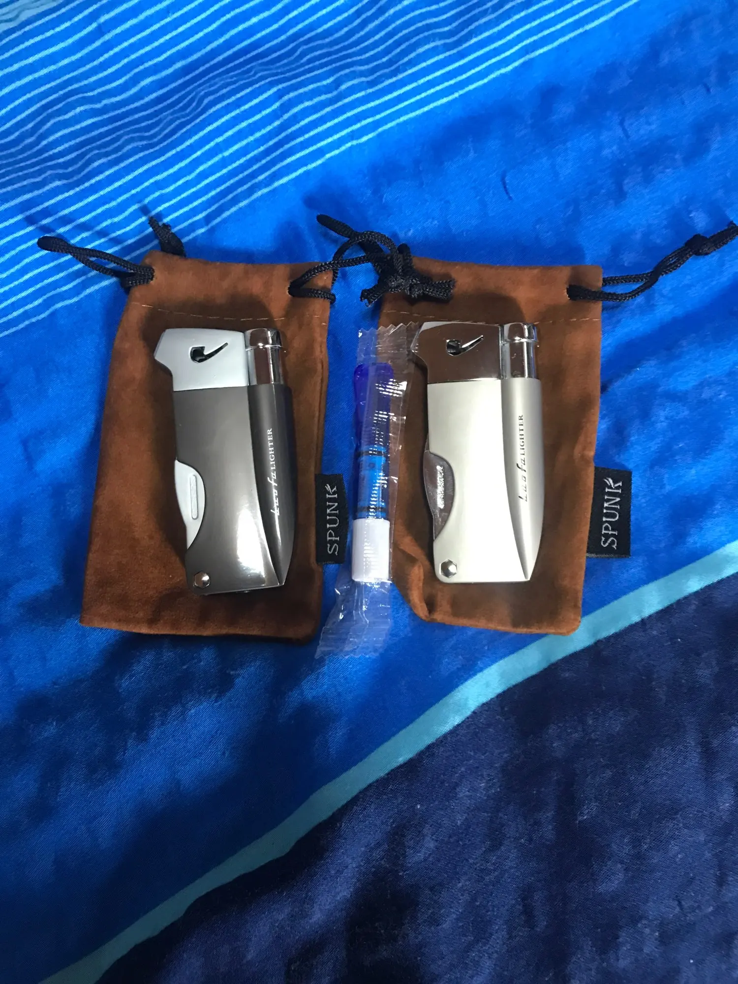 Доставка в течение двух месяцев. Более темная Зажигалка имеет твердую поверхность, а другая-блестящую и гладкую. Приобретено на сумму менее 6 долларов США, включая транспортировку. Оба зажигалки работают. Интегрированный аксессуар для труб сделан из алюминия, вы можете ожидать, что он будет довольно хрупким. Я рад, что зажигалки не турбо. Ответственный поставщик.