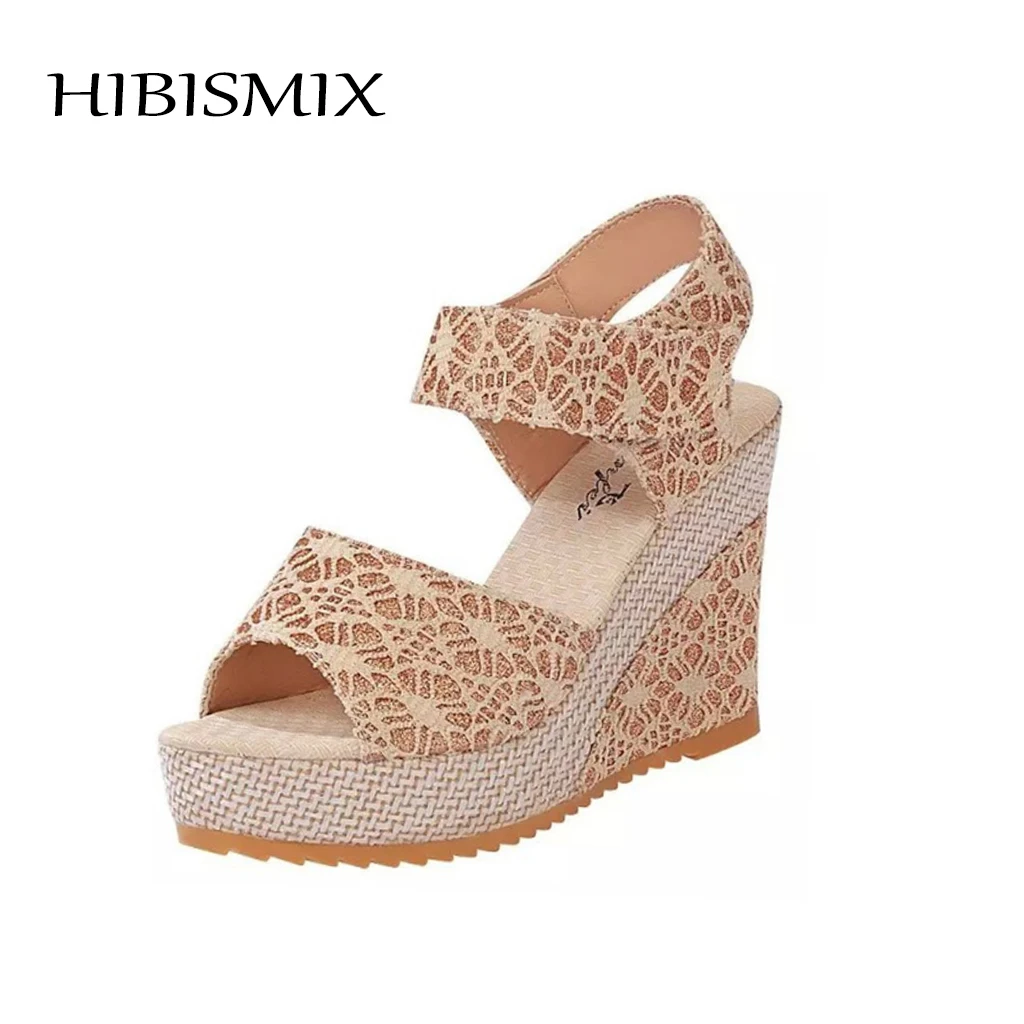 Женские босоножки HIBISMIX на танкетке, модные летние повседневные Босоножки на платформе с кружевом, на липучке, женская обувь на высоком каблуке, 2021, 2041