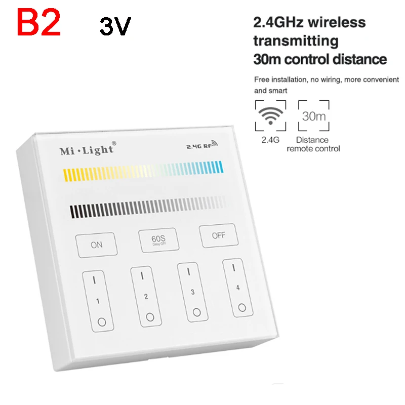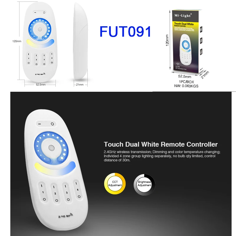 Название продукта:2,4 ГГц 4 зоны RF пульт CCT Управление Номер модели: FUT007 Напряжение: 3 в (sevtion 2 батареи) Частота передачи: 2,4 ГГц Метод модуляции: GFSK Мощность передачи: 6 дБм Стандартное энергопотребление: 20uA Расстояние управления: 30 м Размер: 110*53*21,5 мм
