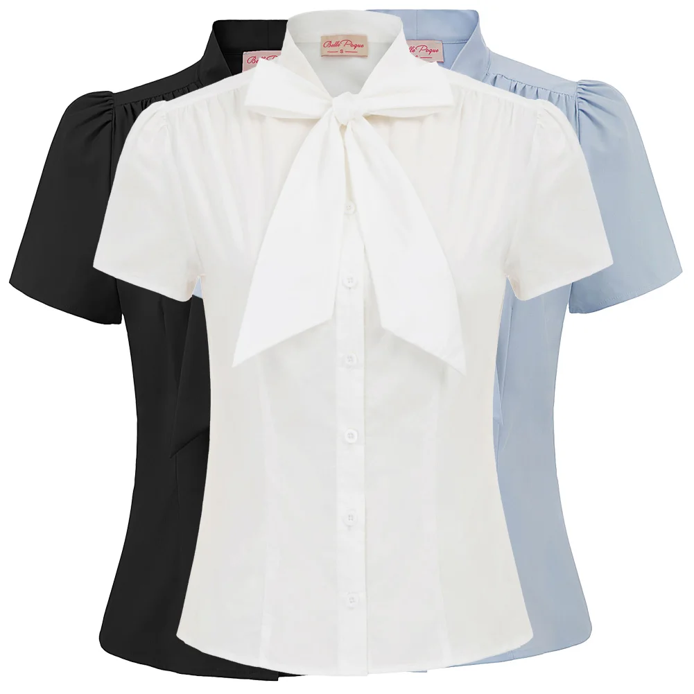Рубашка женская летняя однотонная с коротким рукавом и бантом