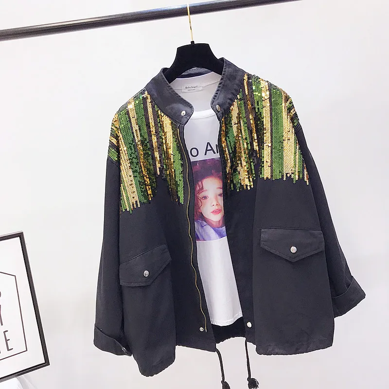 Женская джинсовая куртка Cakucool, камуфляжная куртка-бомбер с блестками и длинным рукавом, на шнуровке, большого размера