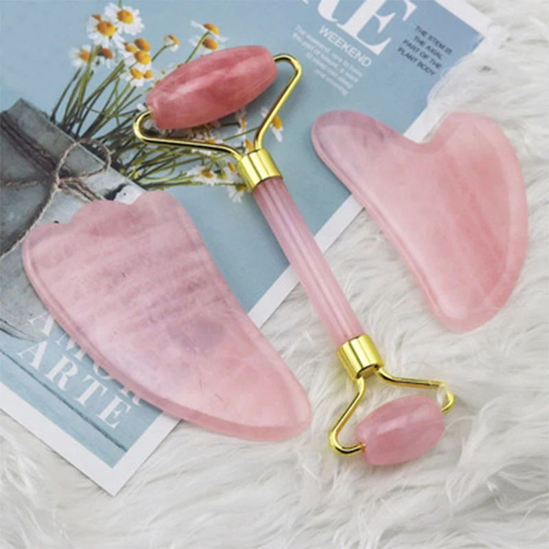 3 в 1 натуральный розовый кварц нефритовый ролик Gua Sha доска массажер для похудения лица массаж лица лифтинг инструмент Настоящий камень Gua Sha комплект
