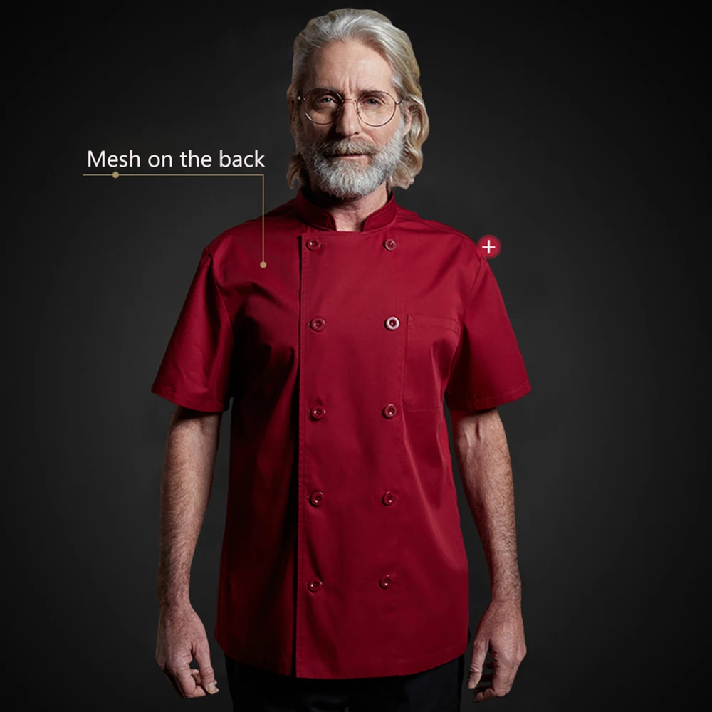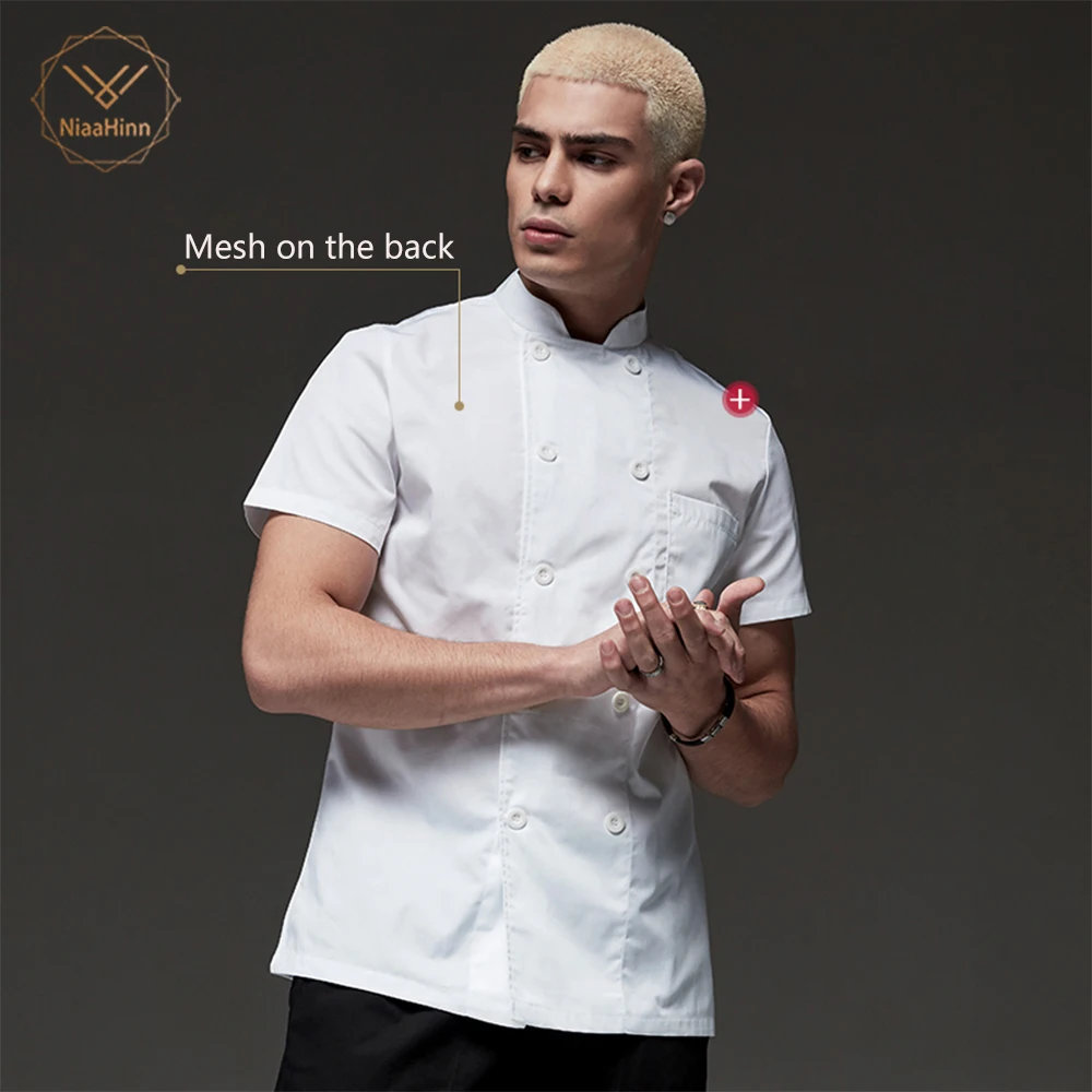 Оптовая продажа черно-белая униформы шеф-повара кухни унисекс с коротким рукавом двубортная поварская одежда куртка шеф-повара гостиницы, униформа для ресторана
