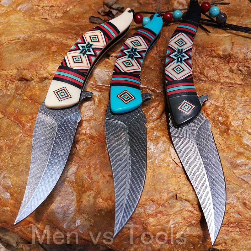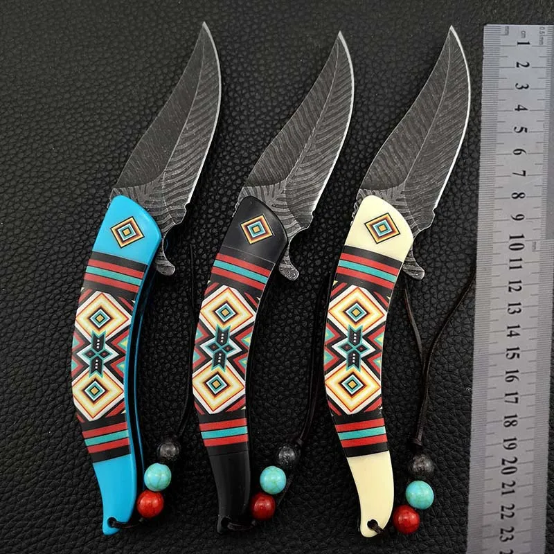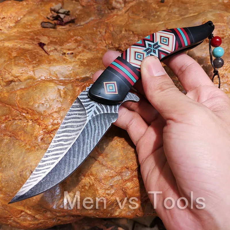 Нож Тактический карманный складной, лезвие из перьев в дамасском стиле, инструменты для выживания