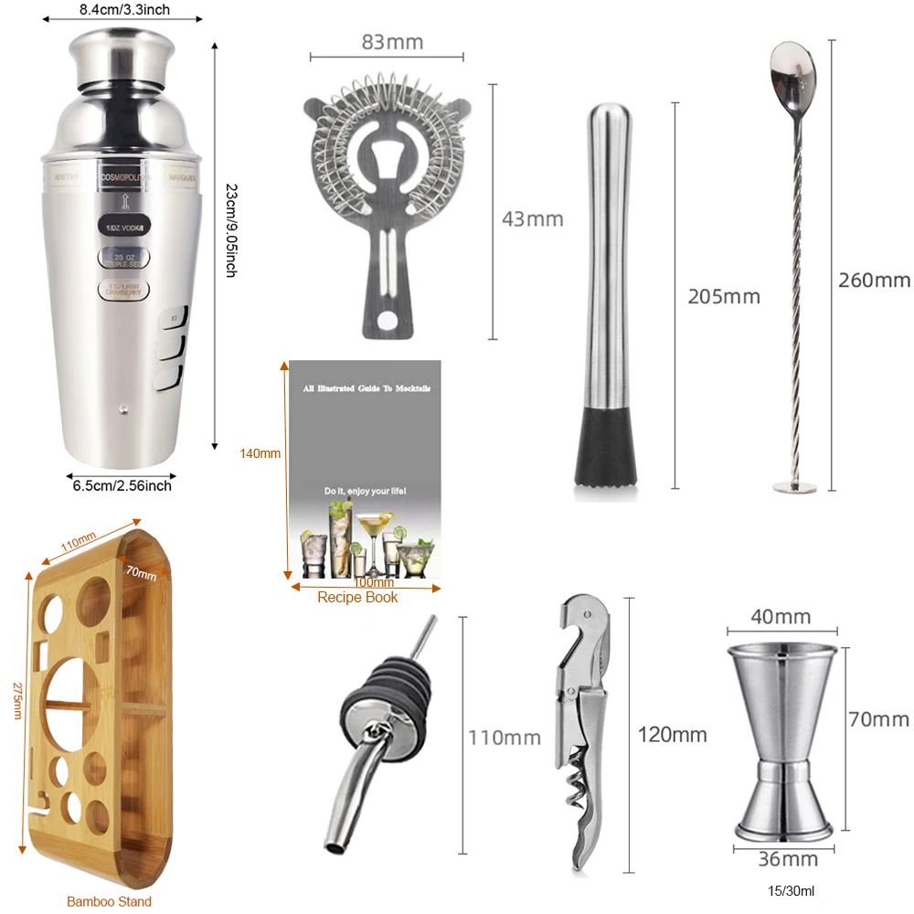 1 х шейкер, 1 x барный пестик, 1 х фильтр, 1 х щипцы для льда, 1 х Ложка, 4 х заливщик, 1x15/30 мл Двусторонняя мерный стаканчик, 1 x канал Ножи, 1 х коктейльный рецепт.