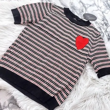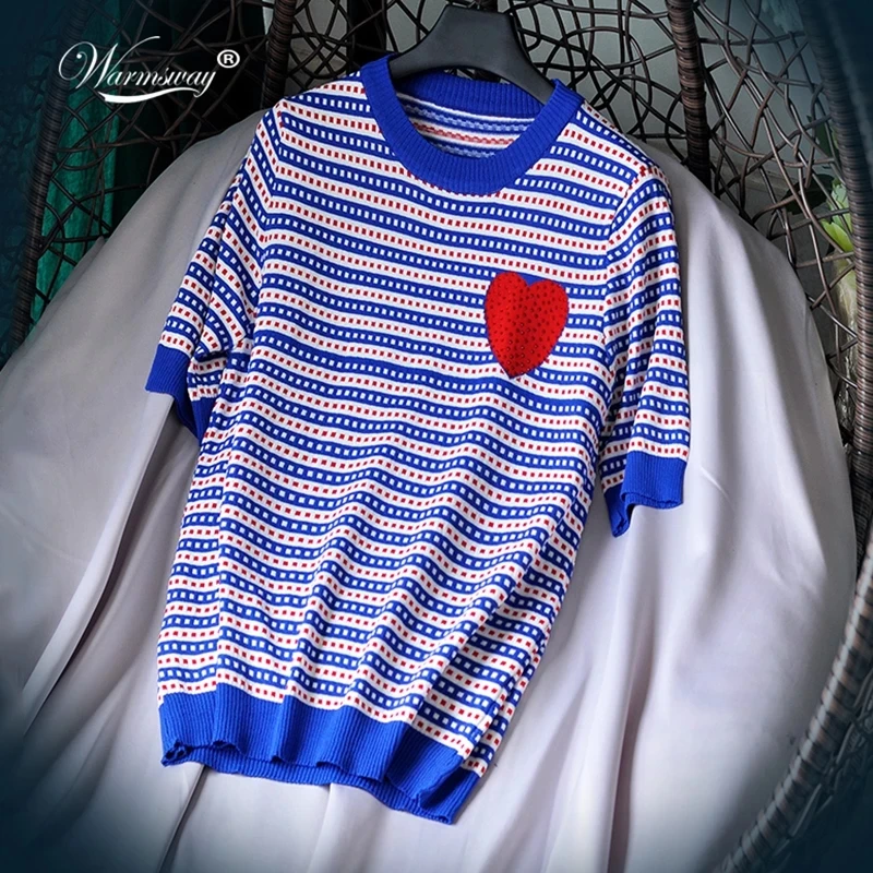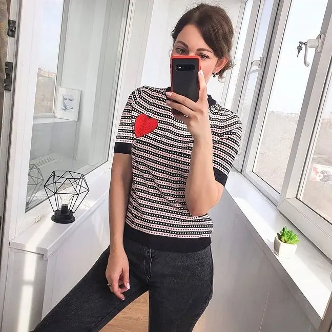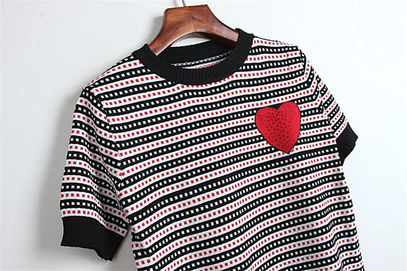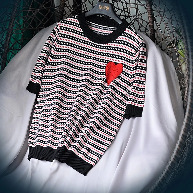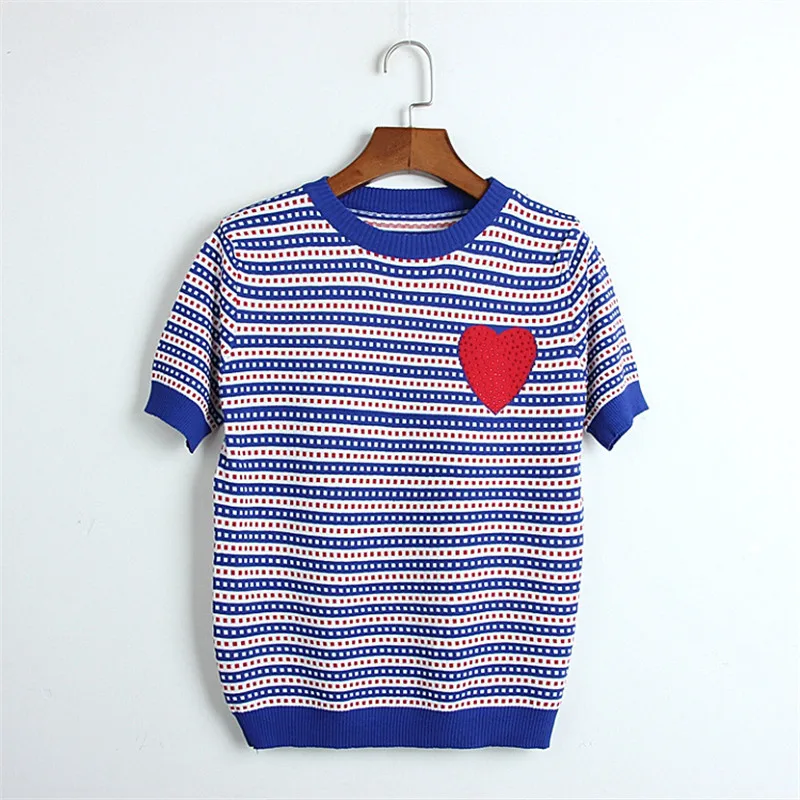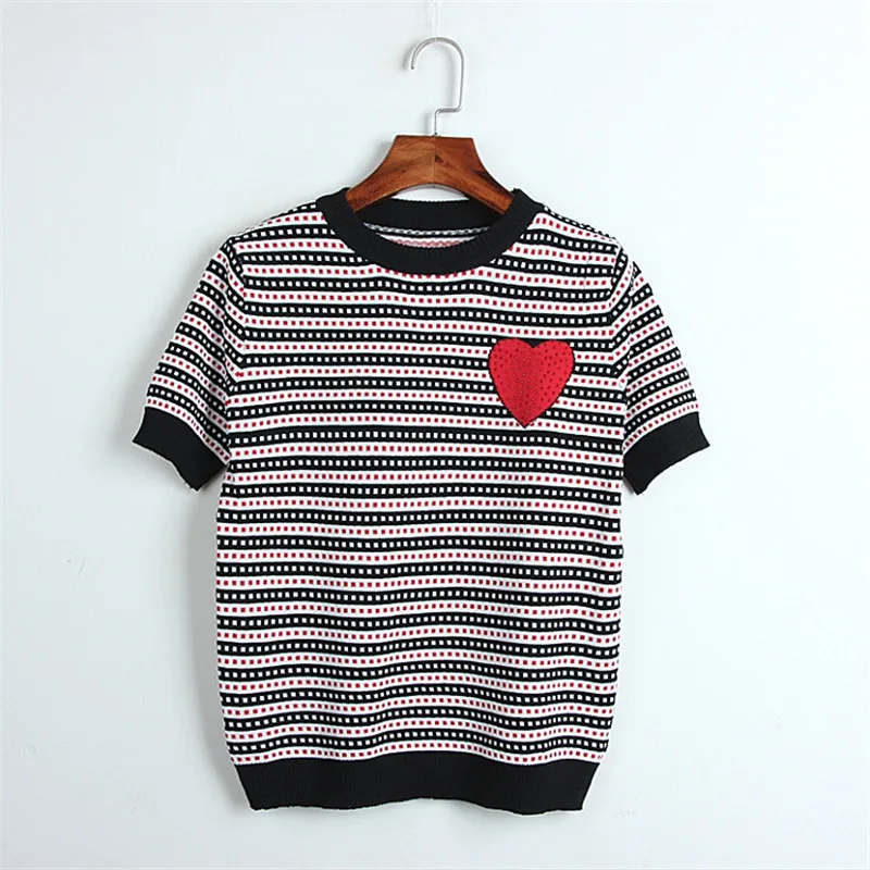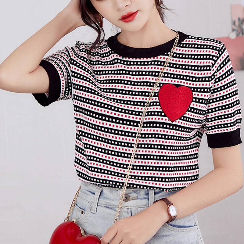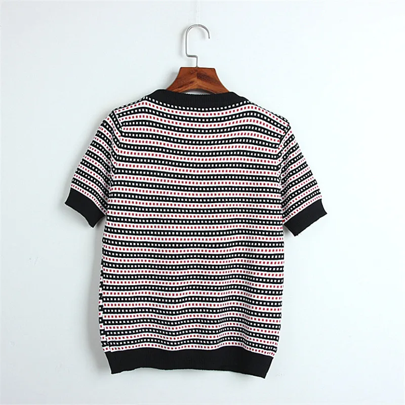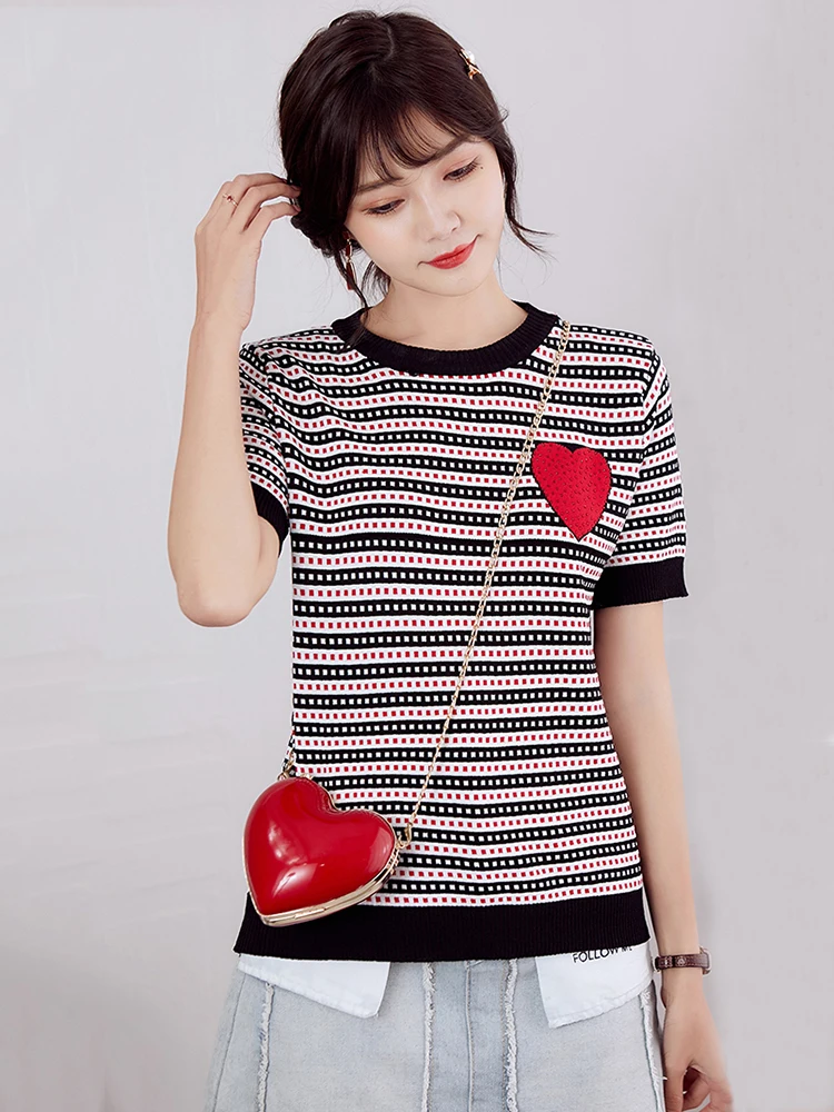 Женская трикотажная футболка, черного и синего цвета, с круглым вырезом, в красную полоску, лето B-090