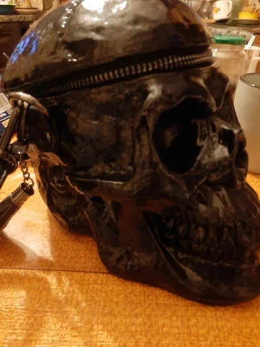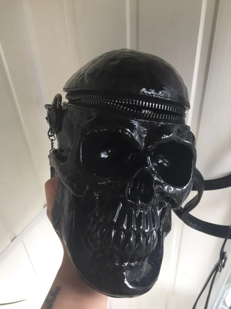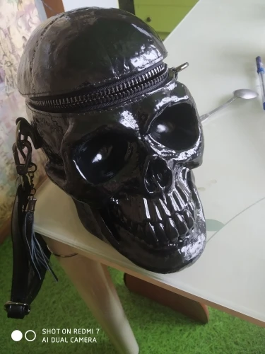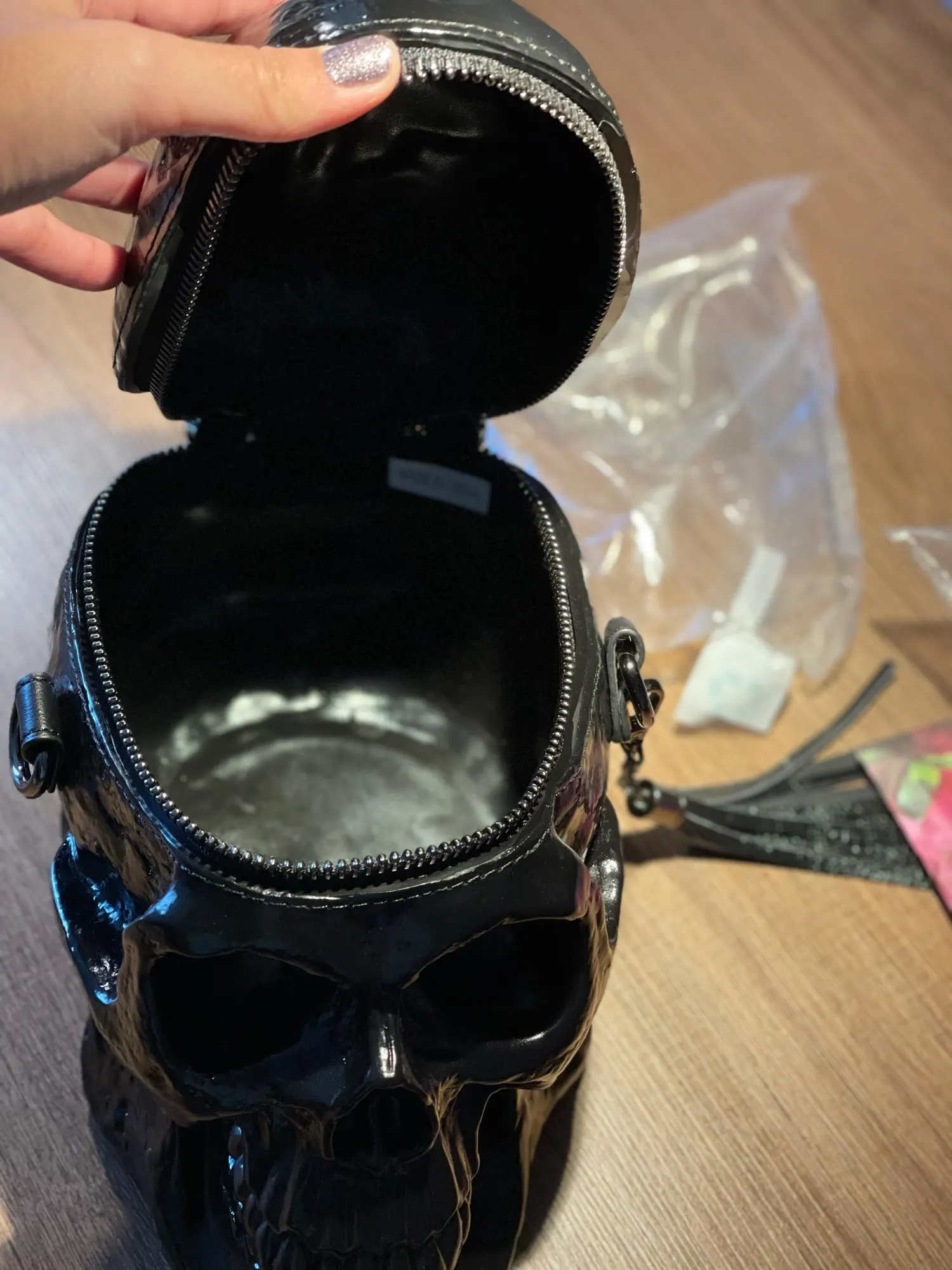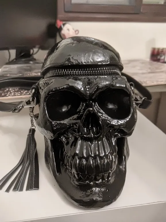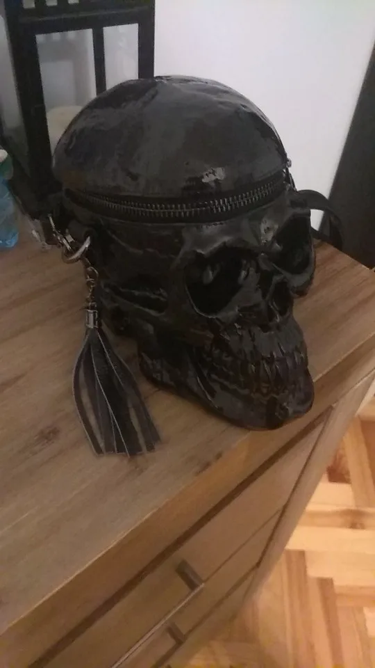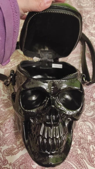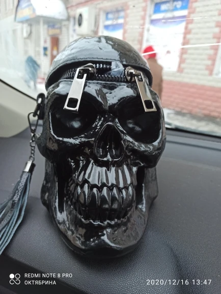 Суперский черепок, давно его хотела. Назову Йориком))). Точно как на фото, надежно упакован и быстро доставлен. По вместительности подходит для ключей и телефонов, большой кошелек не влазит. Маме не понравился, но я в диком восторге, рекомендую!