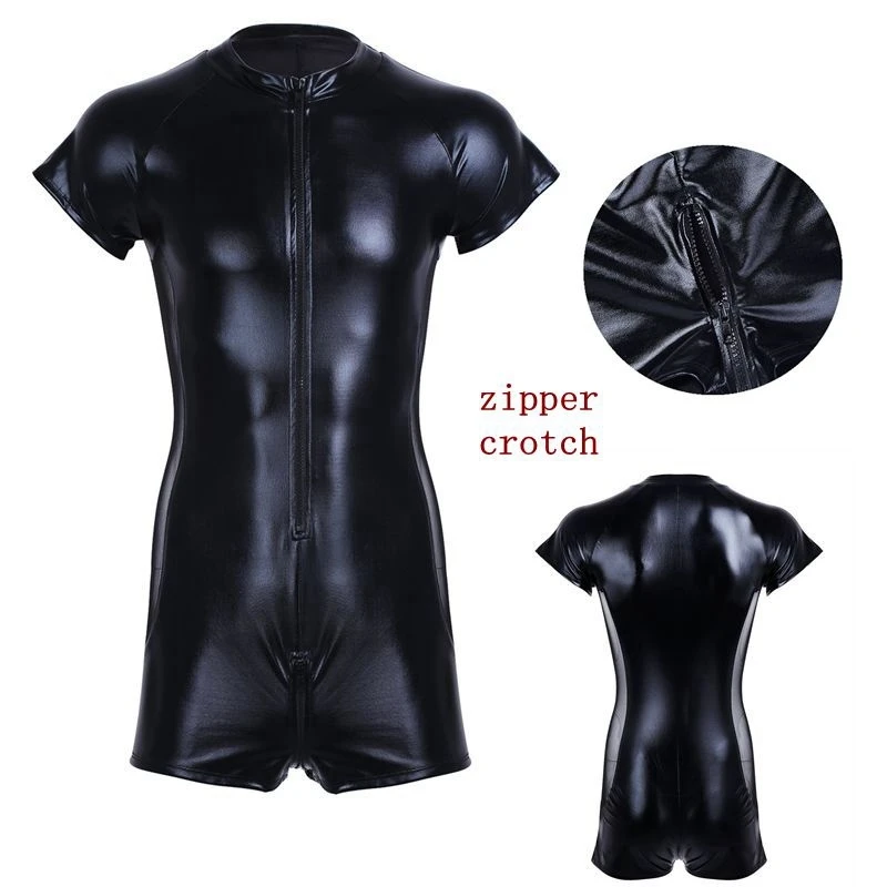 Кожаный мужской слитный купальник на молнии спереди, стринги, трико, боди с прозрачной сеткой сбоку для ночного клуба Вечерние