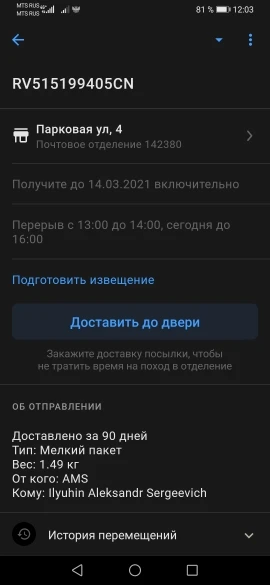 Страна: RU Доставка: Standard Shipping 06.03.2021
