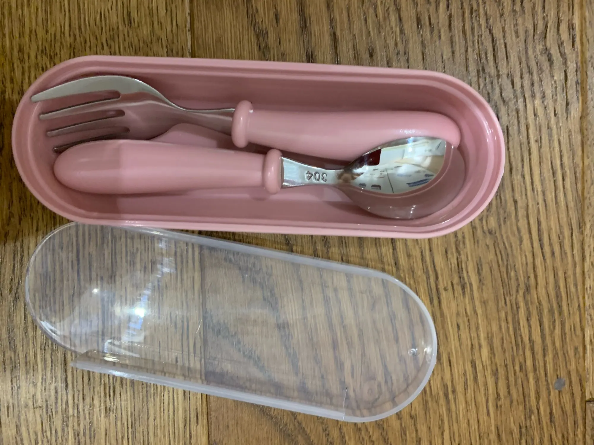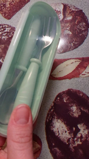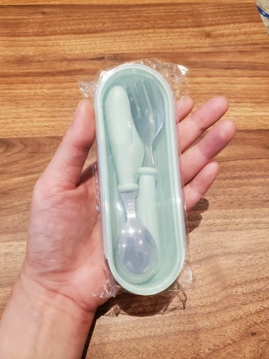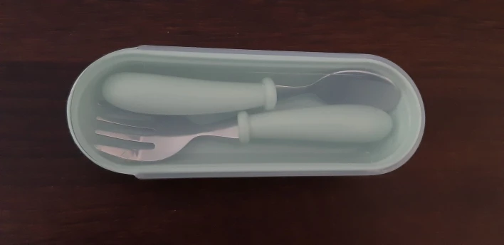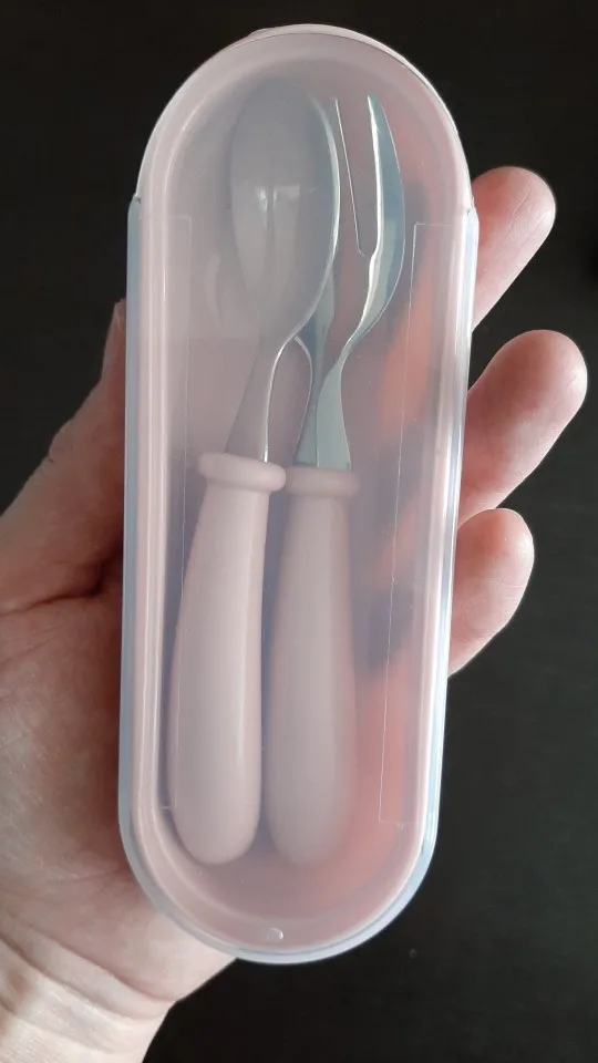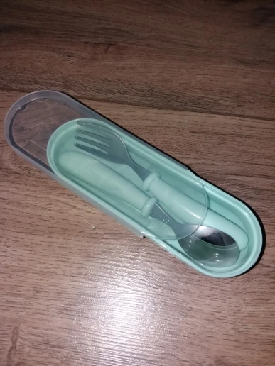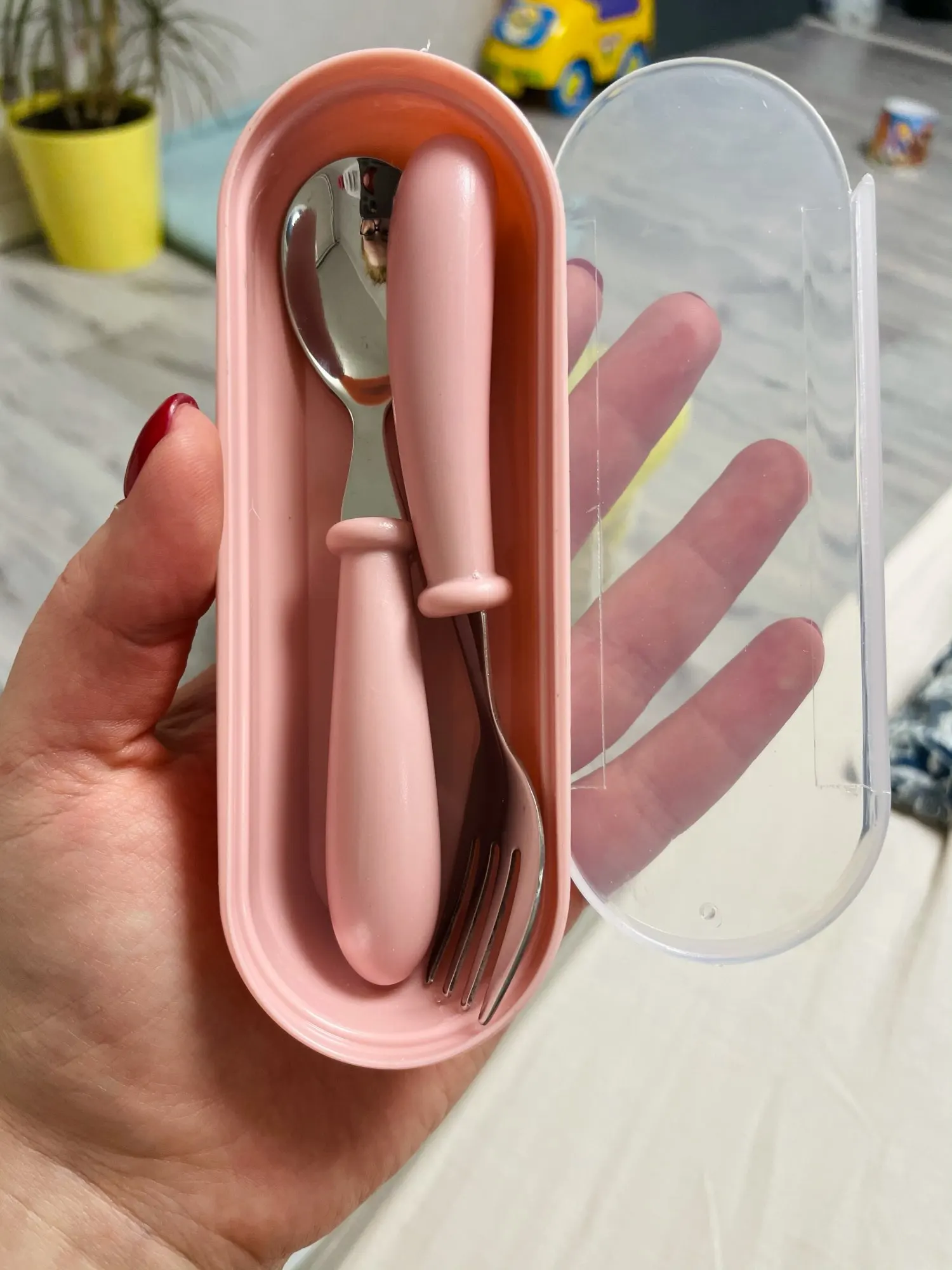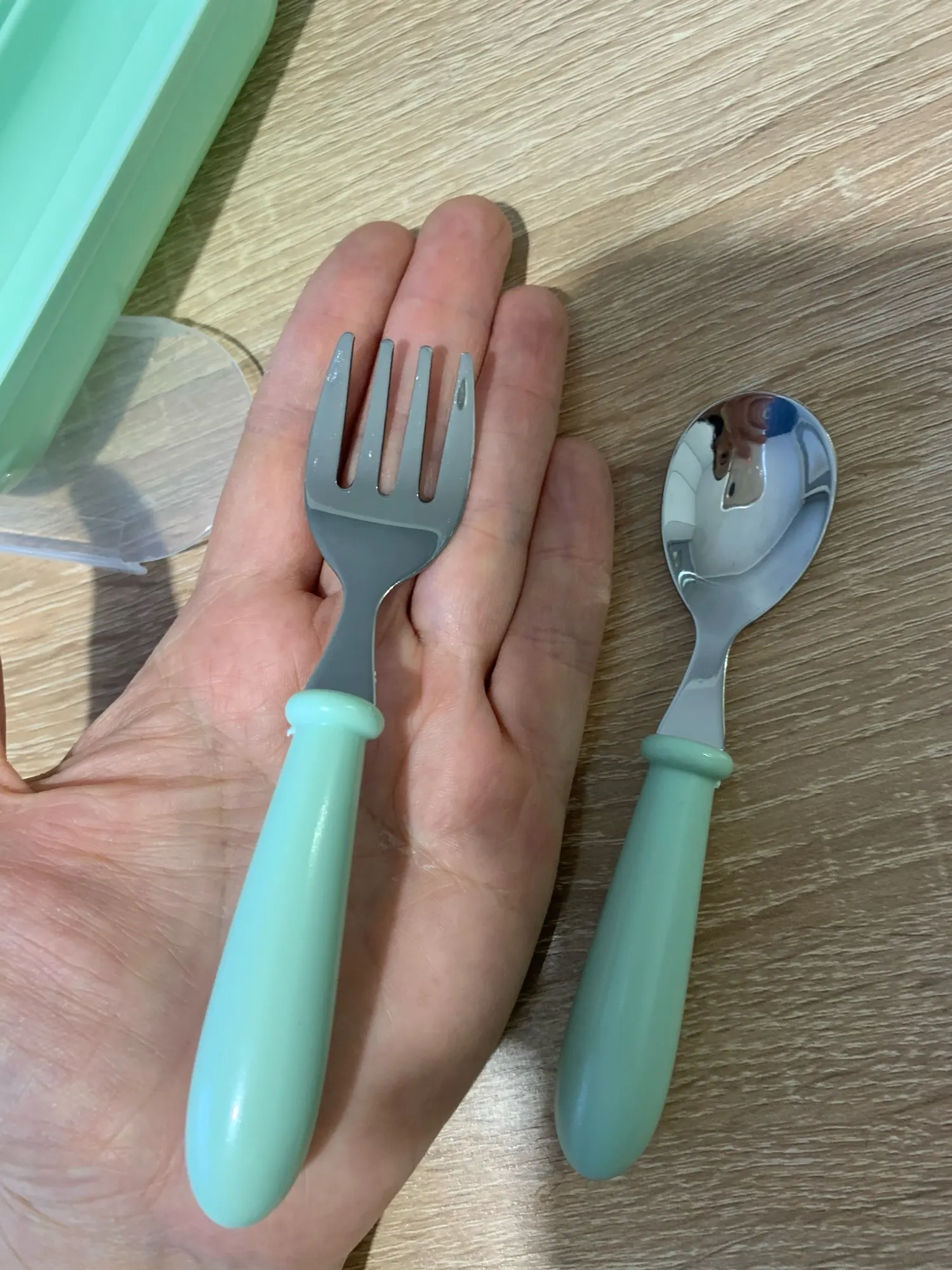 В целом набор нравится. Ложкой активно пользуемся, удобная. Вилка тоже норм, цепляет еду хорошо, но при этом не очень острая, можно и ребёнку дать. Цвет как на фото, чехол удобный, закрывается плотно.