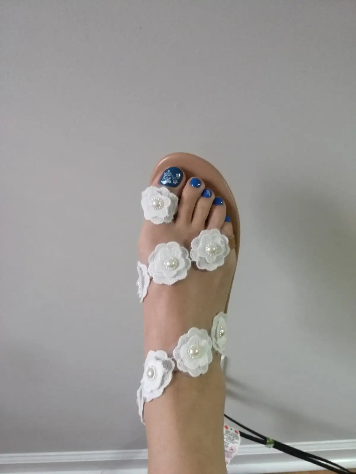 Прекрасные летние сандали. Петля для большого пальца удобная, не жмет. Цветы из ткани пришиты, а камни на металлических фиксаторах (можно не бояться, что декор отклеится в середине отпуска). Заказывала 9,5 для US 9M, российский 41 для 39-40. Подошли идеально. Доставили из Китая в штаты (SC) за 20 дней